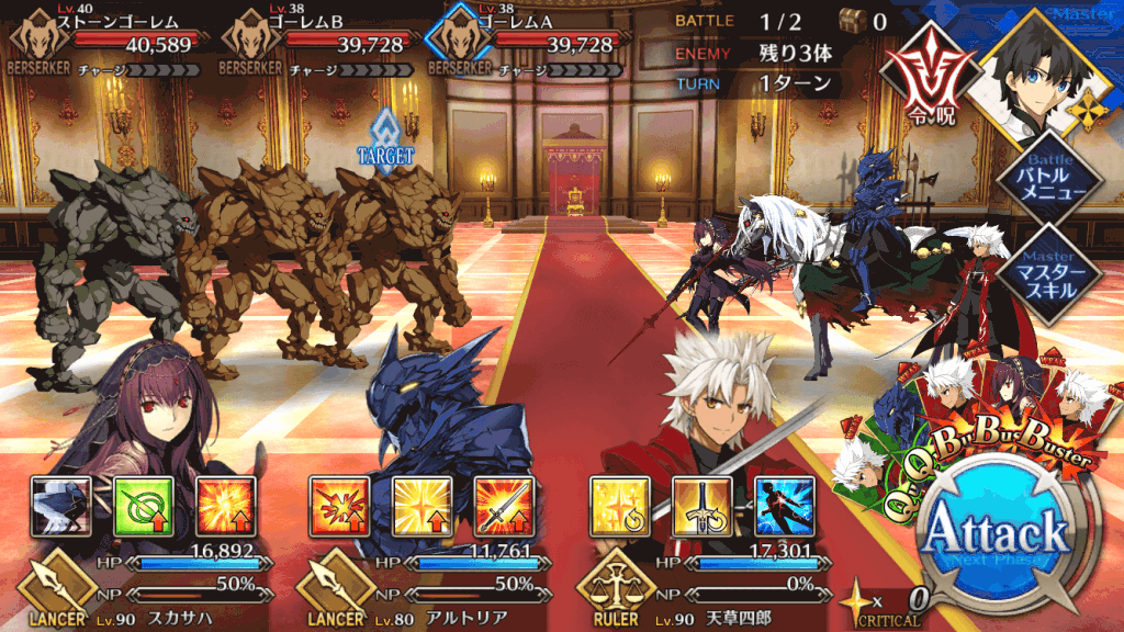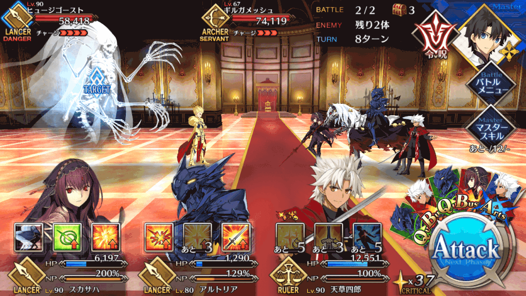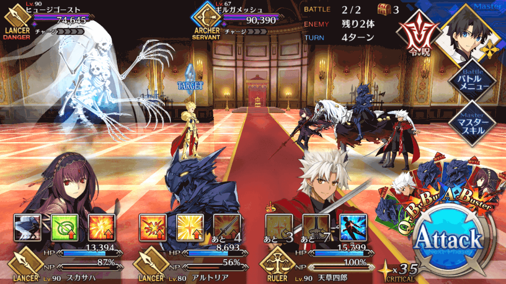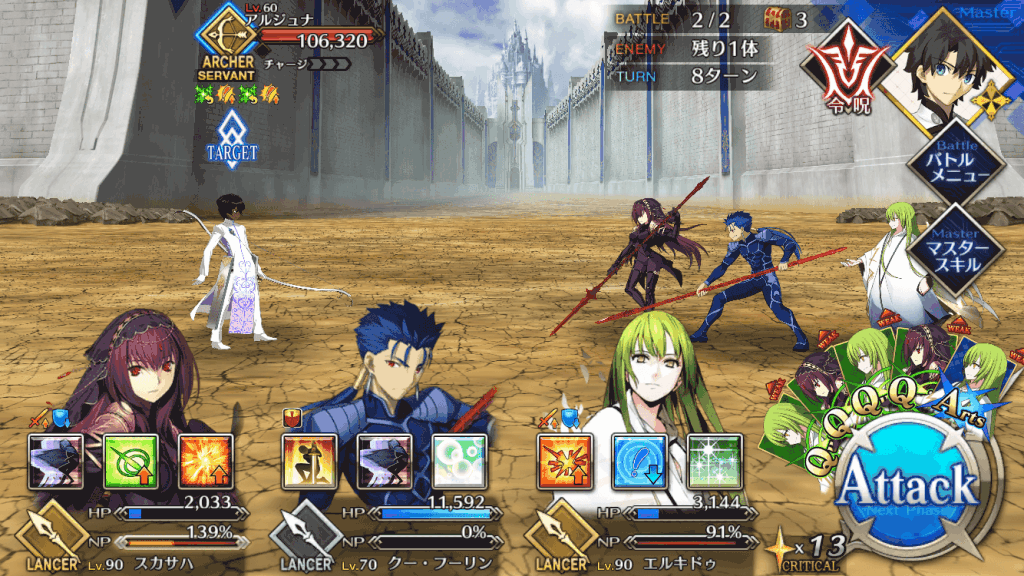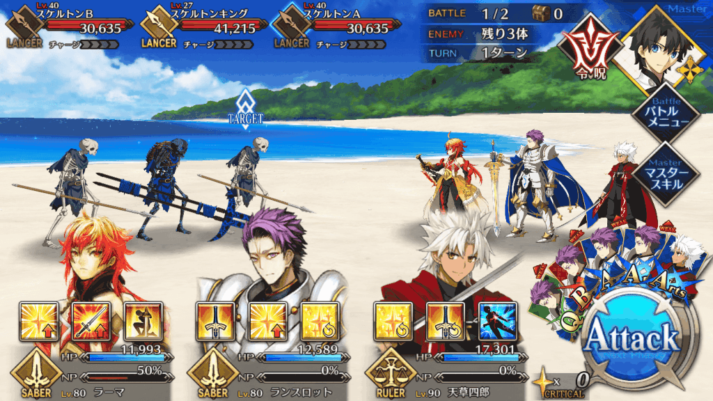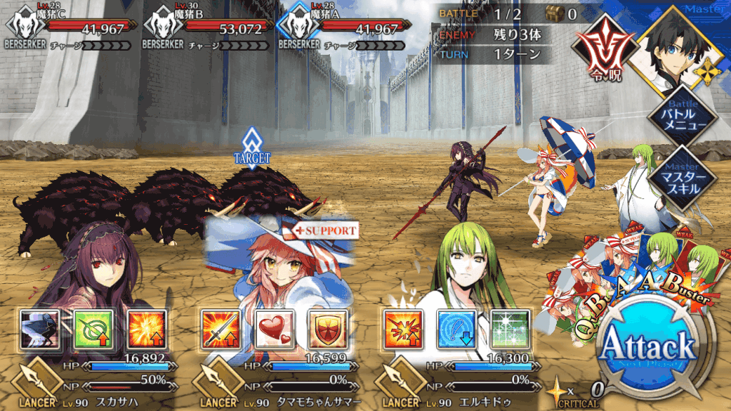 | スキル | ①自身のスター集中度をアップ(1T/300%~500%) ②自身のクリ威力をアップ(1T/50%~100%) ①味方全体の攻撃力をアップ(3T/9%~18%) ①自身にガッツを付与(3T/1回/1,000) ②HPを回復(1,000~3,000) ③NPを増やす(20%~30%) ④スターを獲得(10個~20個) |