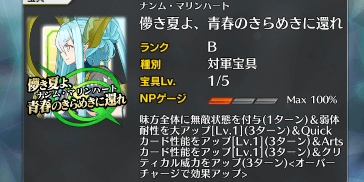 | 宝具 | ・味方全体に無敵状態を付与(1T)<-> ・Lv弱体耐性をアップ(3T)<50%~100%> ・Lvクイック性能をアップ(3T)<30%~50%> ・Lvアーツ性能をアップ(3T)<30%~50%> ・OCクリ威力をアップ(3T)<50%~150%> |