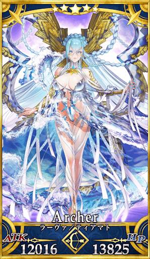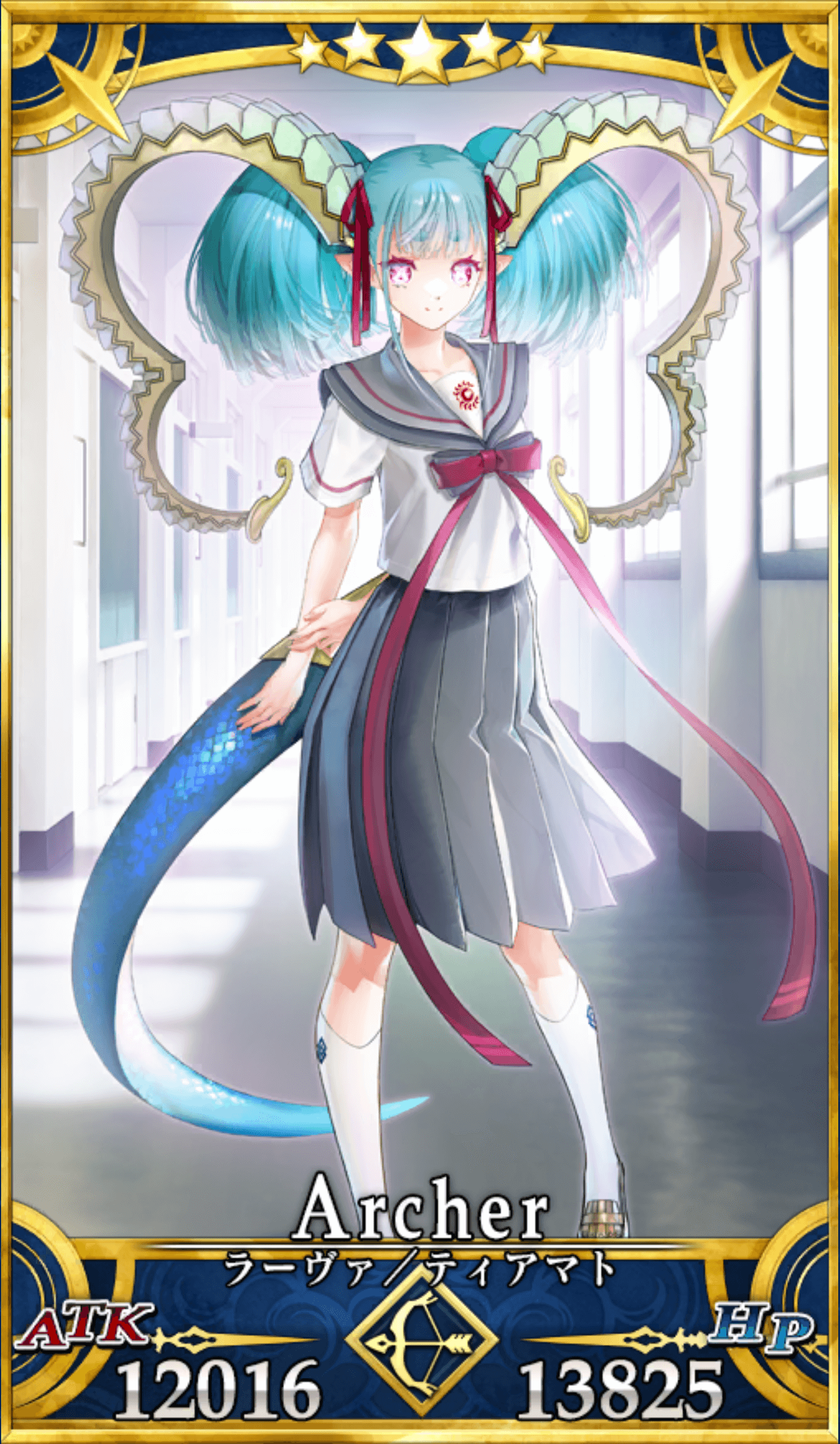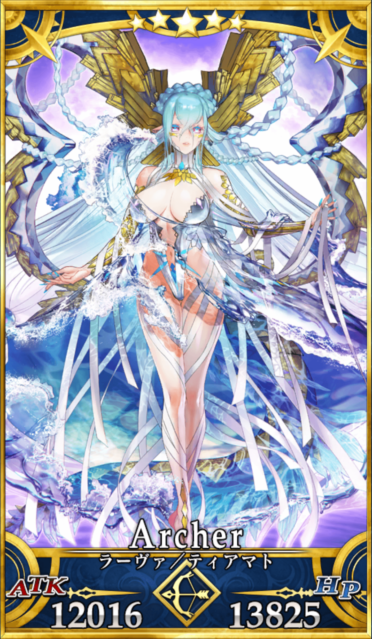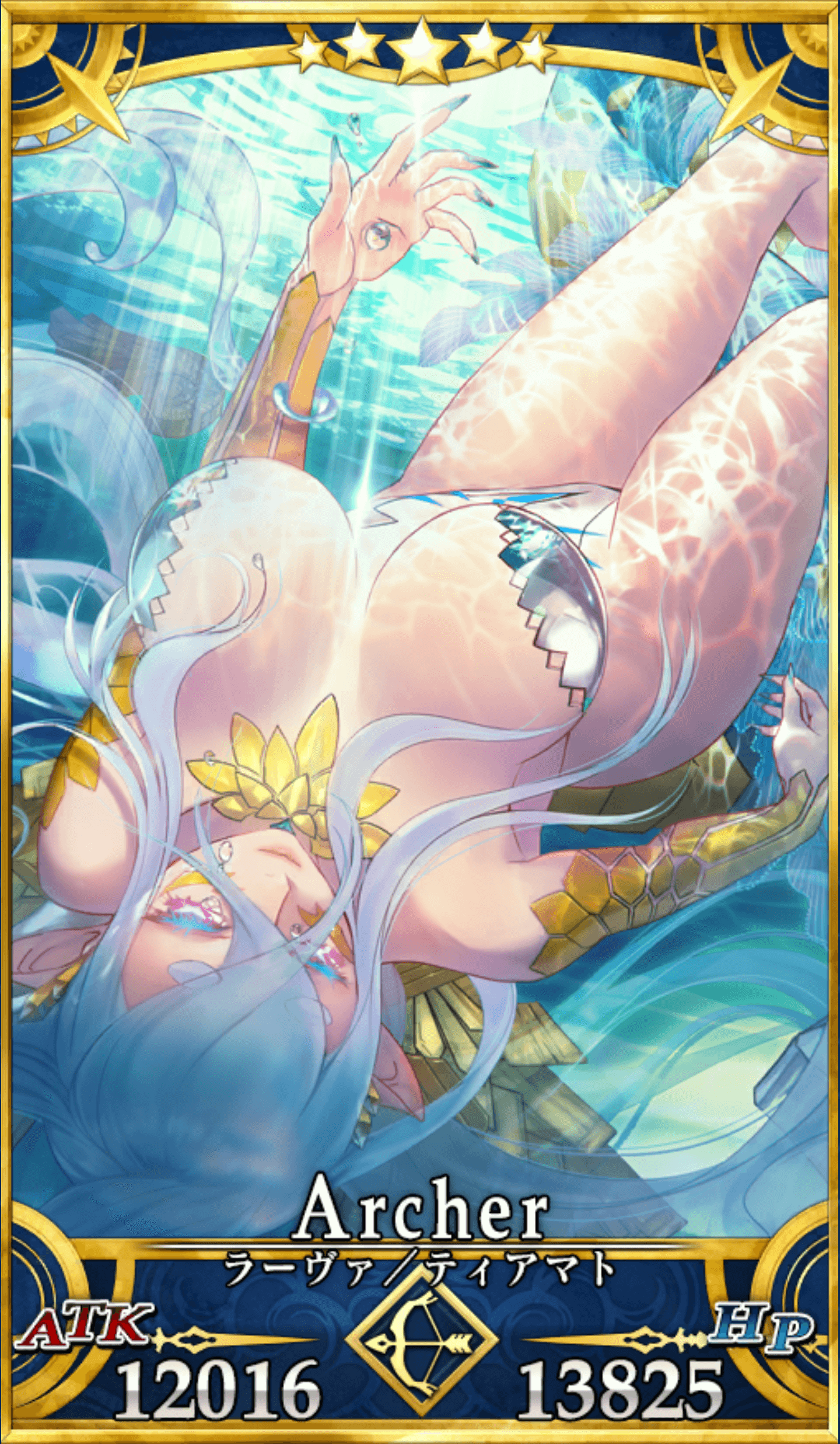 | 特性 | 星属性、混沌、夏、女性、神性、竜、超巨大、魔獣型、ケモノ科、浮遊サーヴァント、夏モードのサーヴァント、ギルガメッシュ宝具特攻対象外 | |
