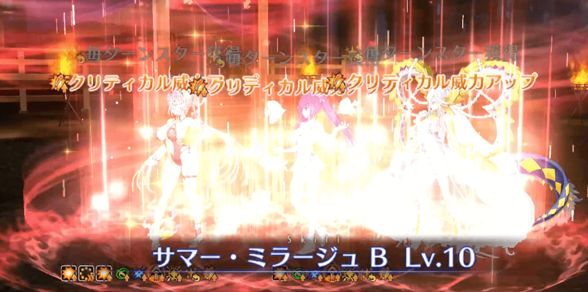 1.味方全体の攻撃力をアップ(3T/20%) 2.〔夏モードのサーヴァント〕の宝具威力をアップ(3T/20%) 3.スターを獲得(15個) |