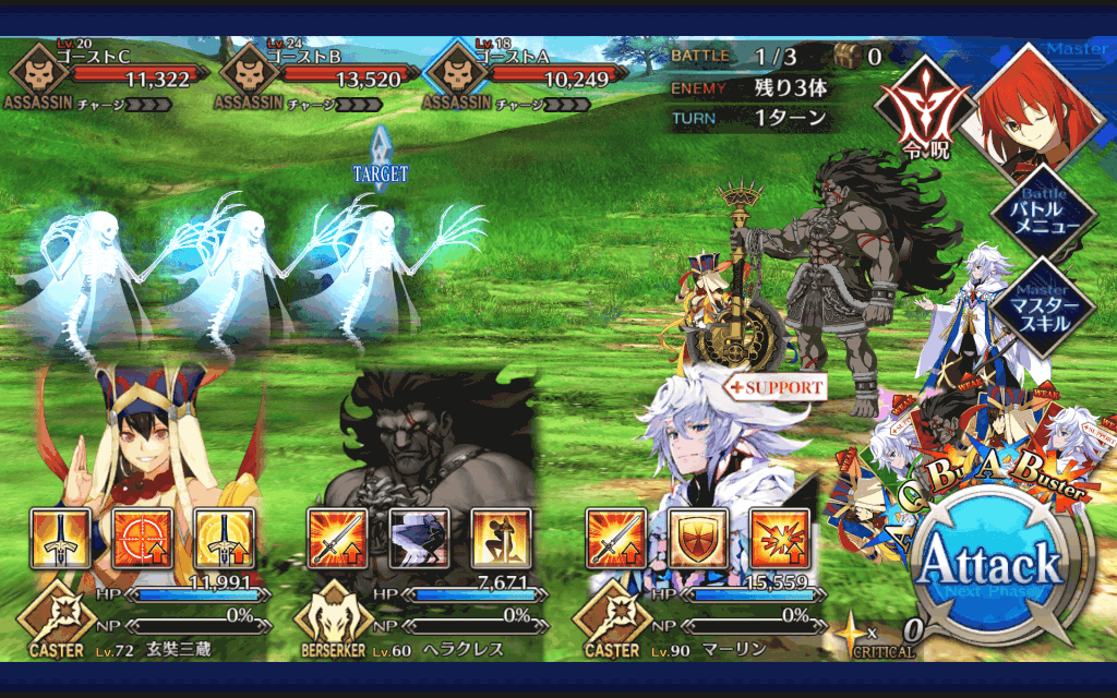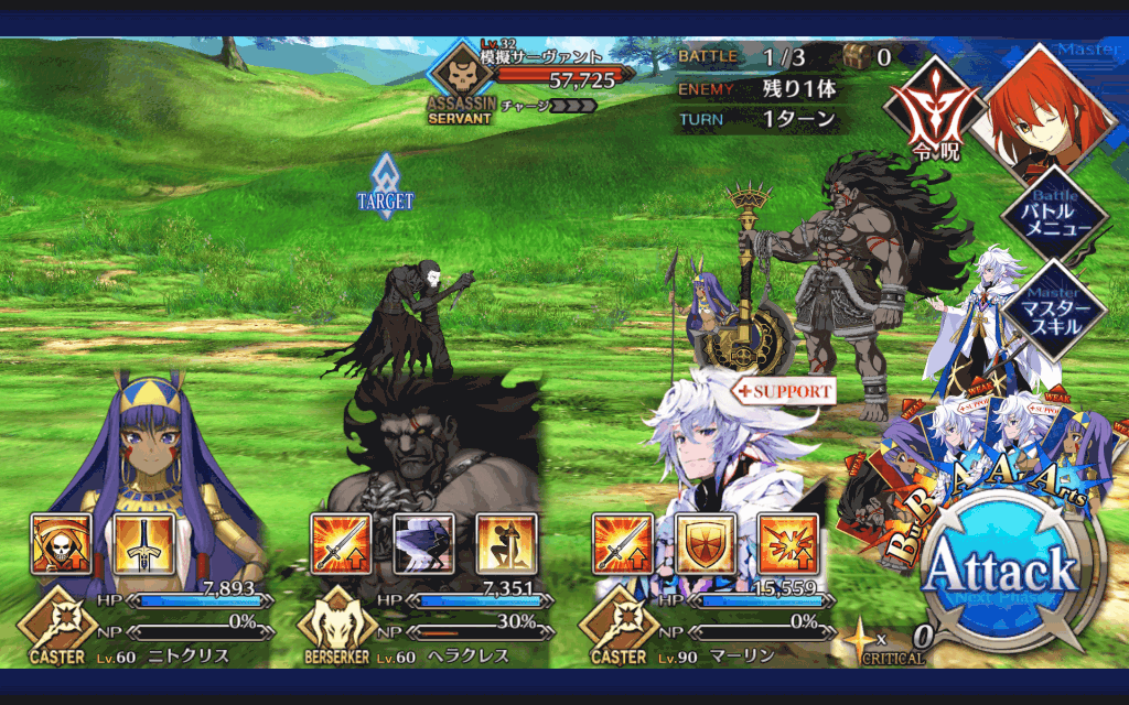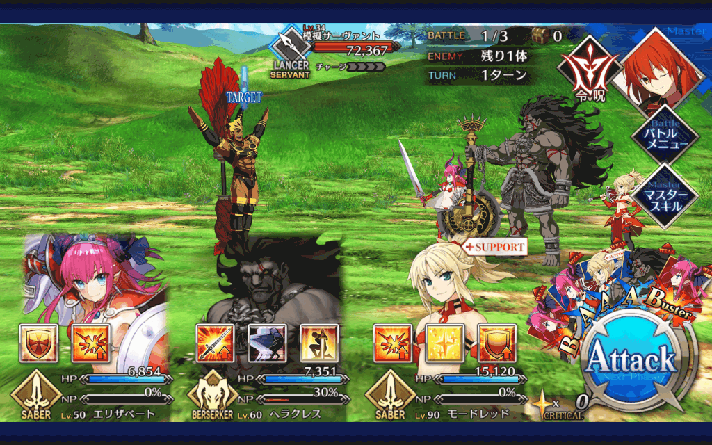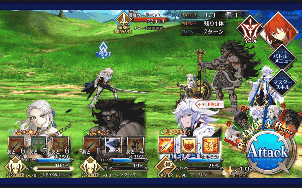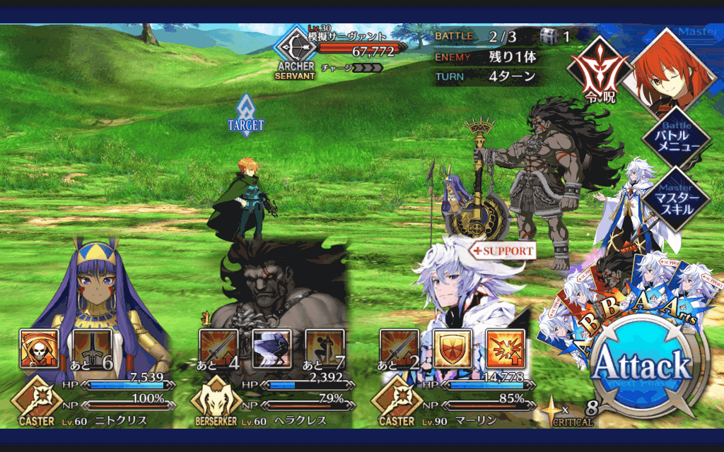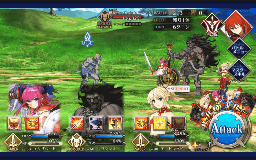| スキル | ①自身にターゲット集中を付与(1T) ②NP獲得量をアップ(3T/50%~100%) ①自身に重複可能なガッツを付与(5T/1回/2,000~5,000) ②「ガッツ発動時に味方全体に攻撃力アップ(3T)を付与する状態」を付与(3T/20%) ①味方全体のバスター性能をアップ(3T/15%~25%) |
