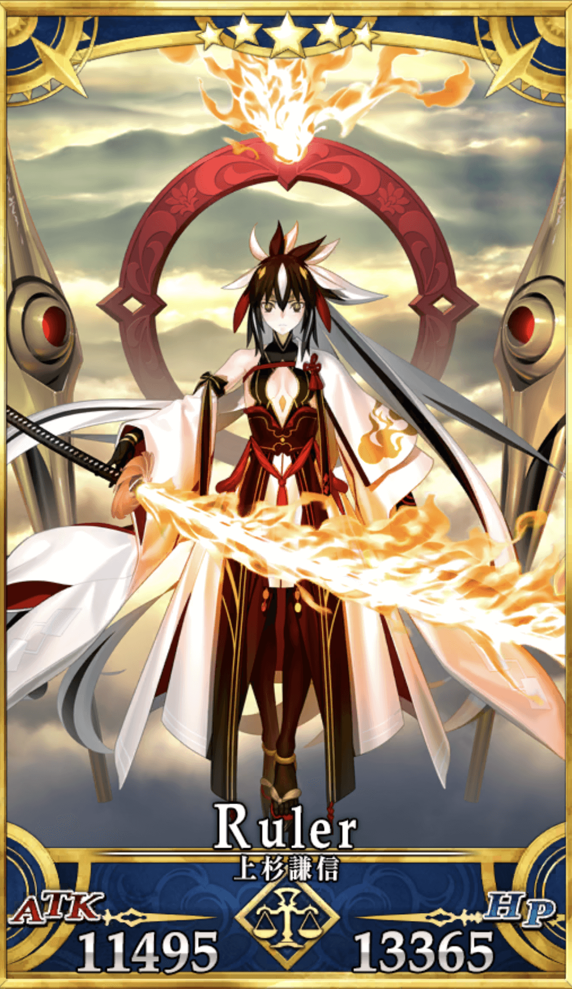 | 長尾景虎でなく、本来あり得なかった戦場の裁定者としての姿で現界した。それ故か上杉謙信と名乗っている。 本来の適性クラスはランサー、ライダー、セイバーであるが、そのどれでもないルーラークラスでの現界にはとある理由がある。 人ではない『何か』として生まれ、人というものを理解できずに、人ではない『何か』として死んだ。それが本来の景虎であったが、カルデアという特殊な環境においてそのあり得なかった『何か』と出会う事となった。 第一、第二再臨では従来のランサーとしてのスタイルに近いが、第三再臨時の形態はまさに毘沙門天の化身ともいうべき神仏のごとき威容を誇る。 経を納めた毘天の宝塔。燃え盛る火焔光輪。もはや武将という枠に収まらないファイナル毘沙門天スタイル。 「八華の備えはいくつか置いてきましたが、総合火力は遥かに増しておりますのでご安心を」 |