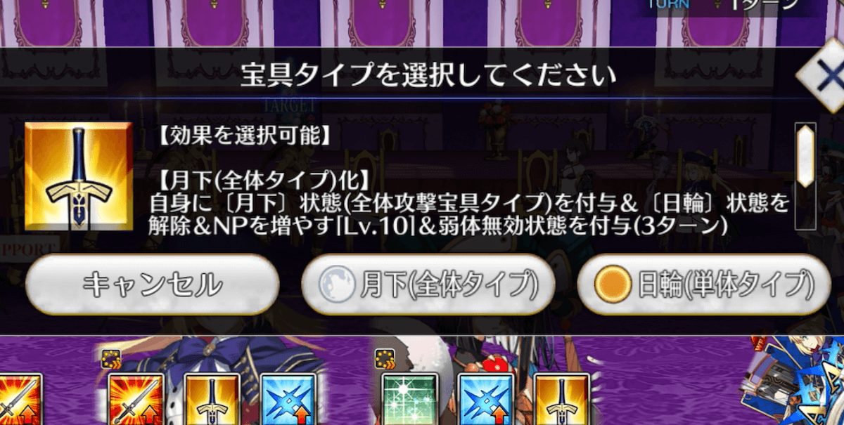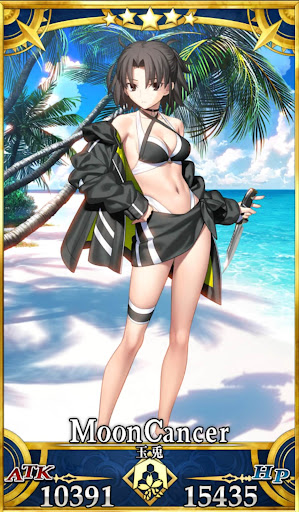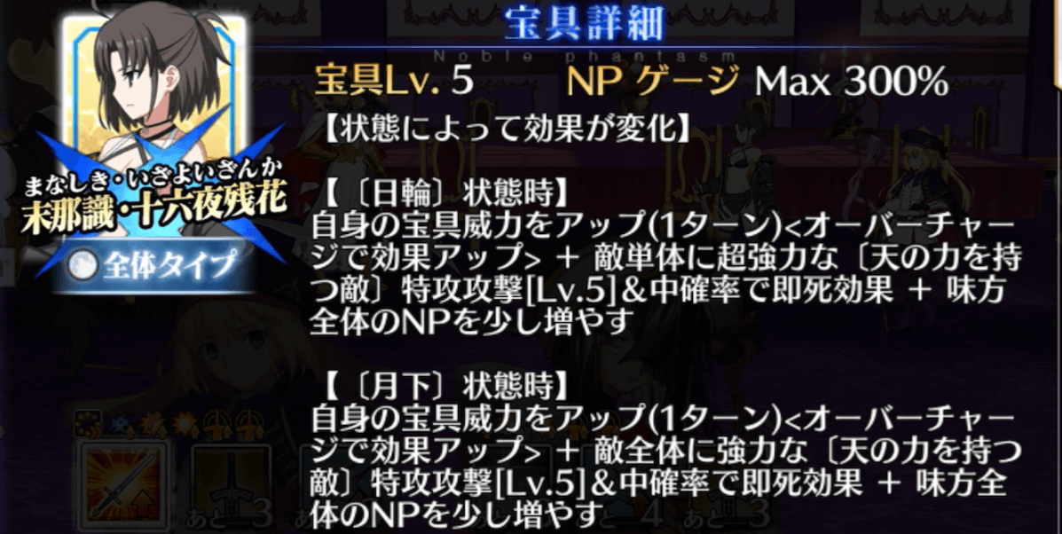 | 宝具 | ・OC自身の宝具威力をアップ(1T)<20%~40%> ・Lv〔日輪〕時、敵単体に超強力な攻撃<900%~1500%> ・Lv〔月下〕時、敵全体に強力な攻撃<450%~750%> ・〔天の力を持つ敵〕特攻<150%> ・確率で即死付与<60%> ・味方全体のNPを増やす<10%> |
