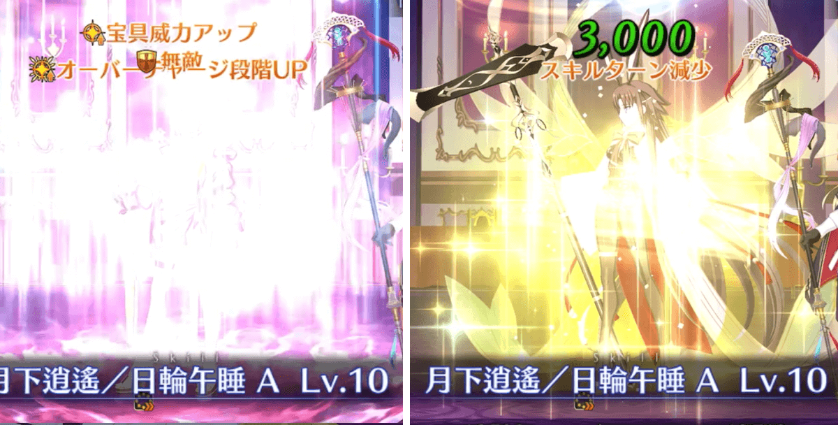 | スキル | ①自身に対粛正防御貫通状態<回避は貫通不能>を付与(3T) ②アーツ性能をアップ(3T/20%~30%) ③即死付与成功率をアップ(3T/100%~200%) ④スターを獲得(10個~20個) ①自身に〔月下〕状態(全体攻撃宝具タイプ)を付与【選択可】(-) ②〔月下〕状態時、〔日輪〕状態を解除(-) ③〔月下〕状態時、NPを増やす(30%~50%) ④〔月下〕状態時、弱体無効状態を付与(3T) ⑤自身に〔日輪〕状態(単体攻撃宝具タイプ)を付与【選択可】(-) ⑥〔日輪〕状態時、〔月下〕状態を解除(-) ⑦〔日輪〕状態時、NPを増やす(30%~50%) ⑧〔日輪〕状態時、強化解除耐性をアップ(3T/50%~100%) ①〔日輪〕状態時、自身の攻撃力をアップ(3T/20%~30%) ②〔日輪〕状態時、クリティカル威力をアップ(3T/30%~50%) ③〔日輪〕状態時、HPを回復(2,000~3,000) ④〔日輪〕状態時、スキルチャージを1進める(-) ⑤〔月下〕状態時、自身の攻撃力をアップ(3T/20%~30%) ⑥〔月下〕状態時、宝具威力をアップ(3T/20%~30%) ⑦〔月下〕状態時、無敵状態を付与(2回/3T) ⑧〔月下〕状態時、OC段階を2段階引き上げる状態を付与(1回/3T/200%) |
