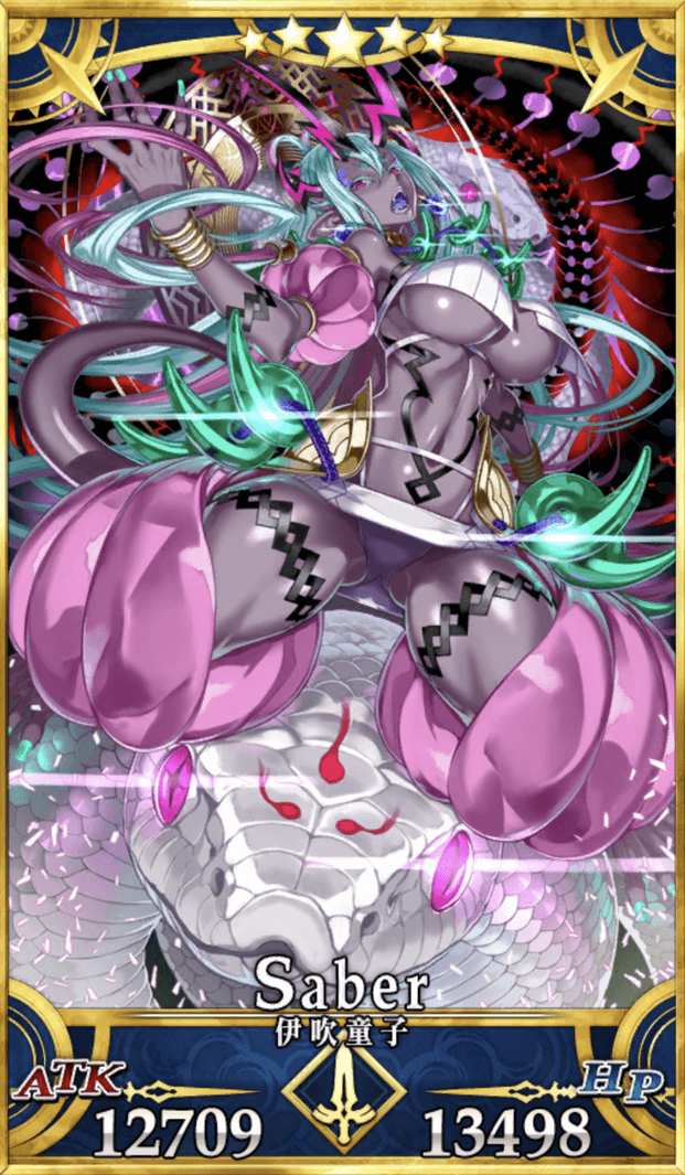 | 特性 | 天属性、混沌、善、女性、騎乗、神性、鬼、竜、蛇、魔性、巨人、魔獣型、ケモノ科、霊衣を持つ者、浮遊サーヴァント、セイバークラスのサーヴァント | |