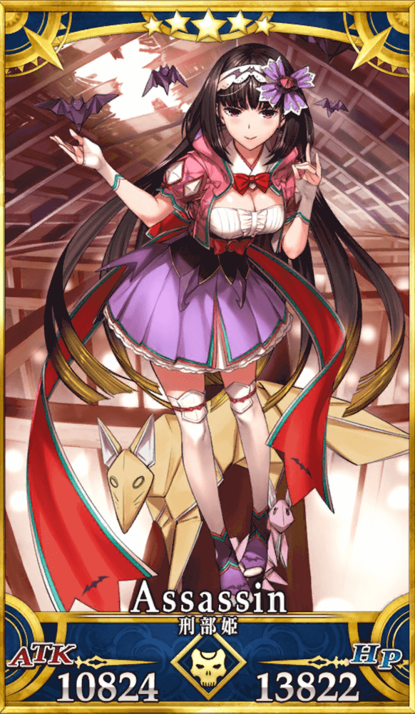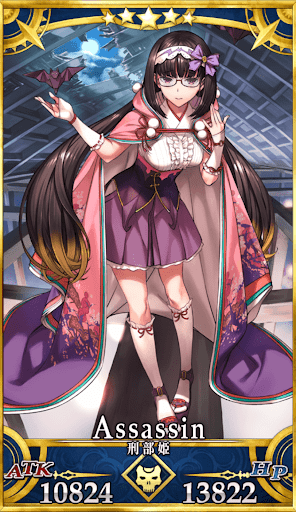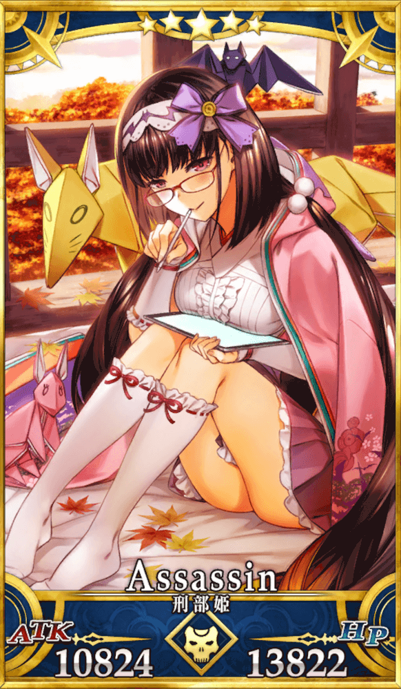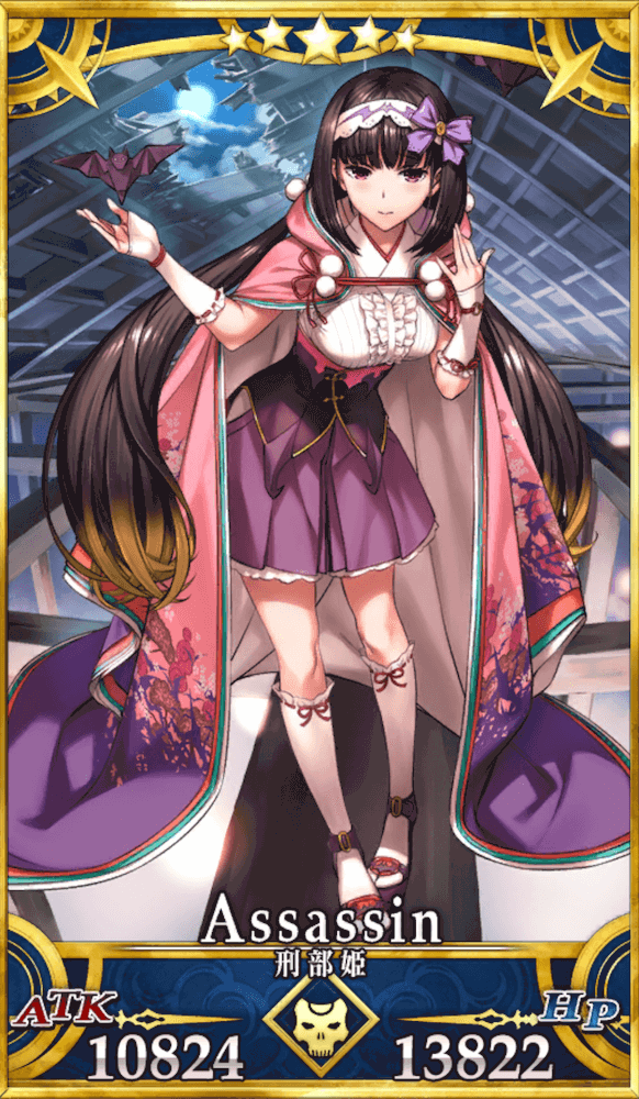 刑部姫は味方の攻守を補助する、アサシンには珍しいサポーター。自身のQ宝具が補助の主軸になるため、周回の補助パーツに採用しにくいが、単騎運用では無類の耐久性を発揮すると特殊な運用も可能である。