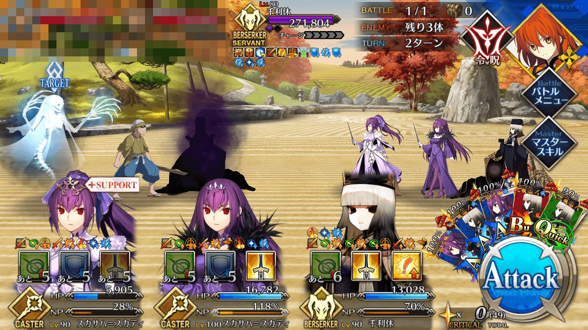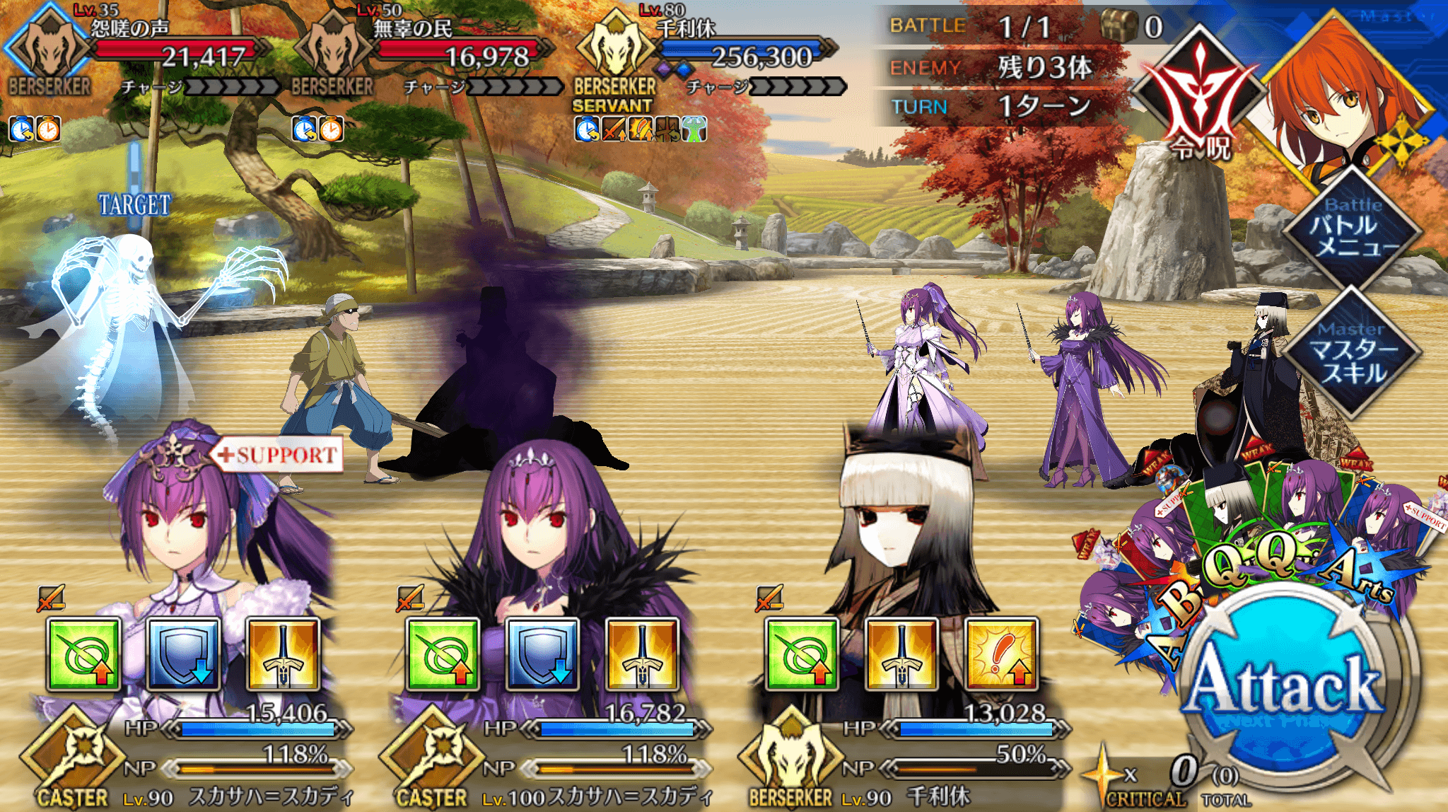 さらに、千利休自身もクイッククリティカル威力アップのスキルを持つため、クイックカードを優先して選択する機会が多い。そのため、クイックカード3枚持ちの千利休とのシナジーが高いのは術の方のスカディと言える。