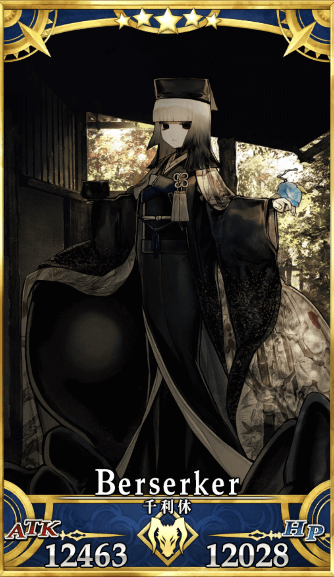 | ○侘びの極み:A- 利休が生涯をかけ追い求め、いまだ到達しえぬ侘び茶の極み。侘びの怪物である利休の深淵より汲み上げられし黒けき茶の湯。 ○一輪の花:B 世に花は一輪あれば良い。己が見いだす価値以外を一顧だにせぬ利休の傲岸な意志の発露。 ○幽玄たる黒:A 利休が至高とした黒。この世の全てを塗り込み黒けき世をもたらさんとする利休の妄執と狂気。 ○融通無碍:B 茶の湯に作法なしとした利休の自由な創意。己の価値が全てとする傲慢さと闊達さを併せ持つ。 「すなわち茶の湯とは、ただ湯をわかし、茶を点て、ただ飲むばかりにございますれば」 |