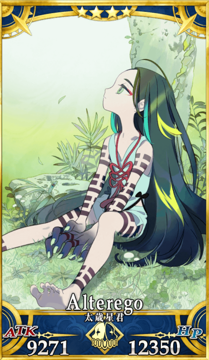 | 宝具 | ・敵全体に〔太歳の禍〕状態を付与(3T)<-> ・呪い状態を付与(5T)<2,000> ・Lv強力な攻撃<450%~750%> ・OC〔人の力を持つ敵〕特攻<150%~200%> |