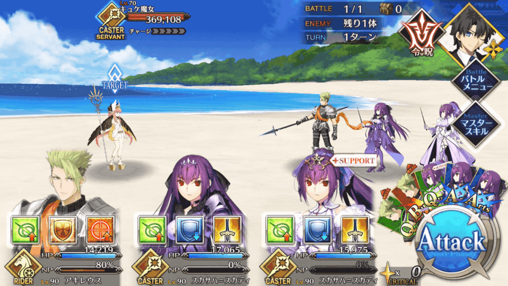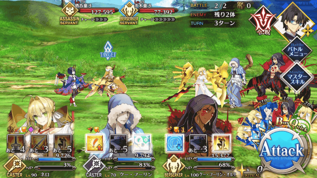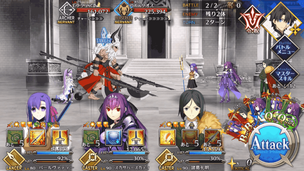 メイヴは男性特性が相手なら、特攻宝具で大ダメージを狙えるアタッカーだ。味方の男性にも攻撃力アップやNP30%チャージを付与してサポートできるのが強み。自身へのHP回復や弱体無効、敵単体への魅了付与で耐久戦も得意。