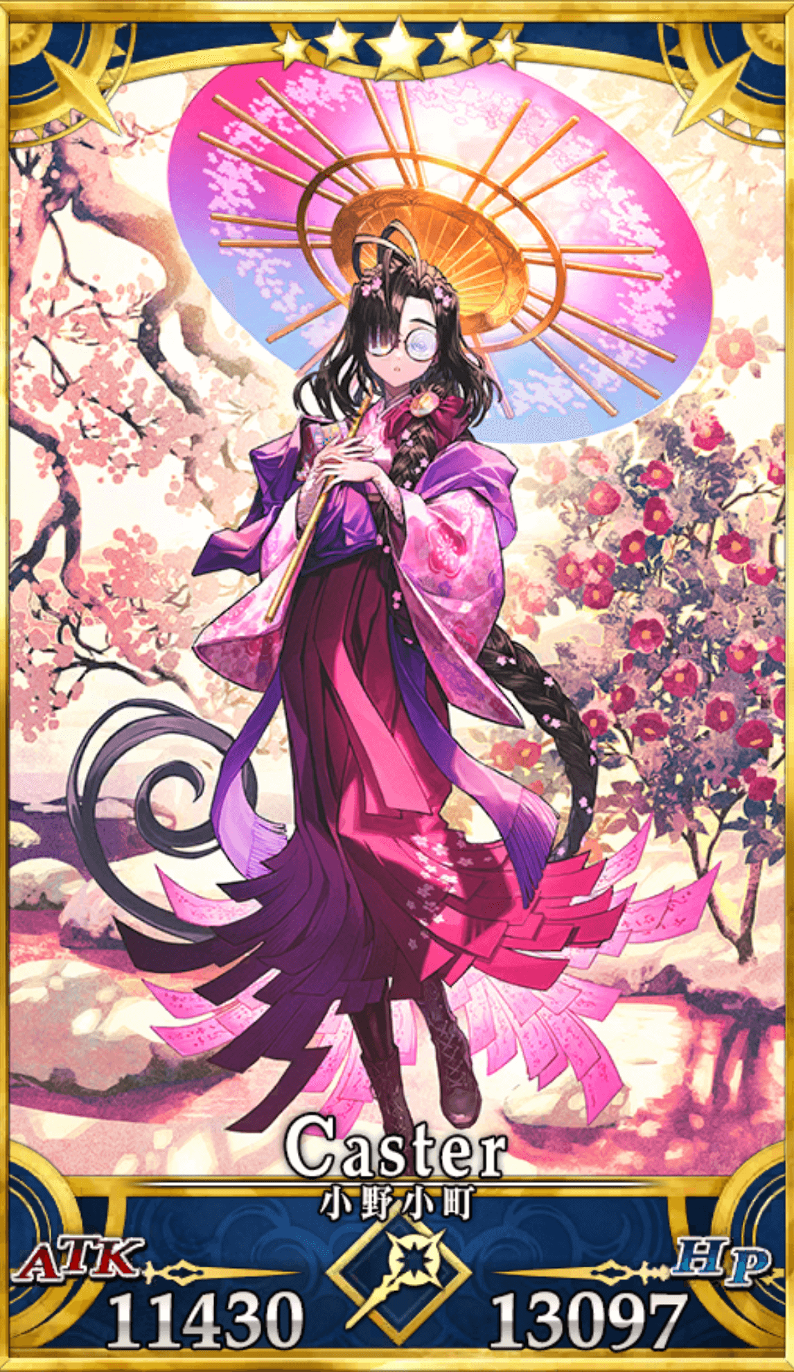 | 身長/体重:160cm・49kg 出典:史実、小野小町伝説など 地域:日本 属性:中立・中庸 副属性:天 性別:女性 幸運のパラメーターが高いのは、自分は出逢いの運がよいからだと思う、と小野小町自身は語っている。 |