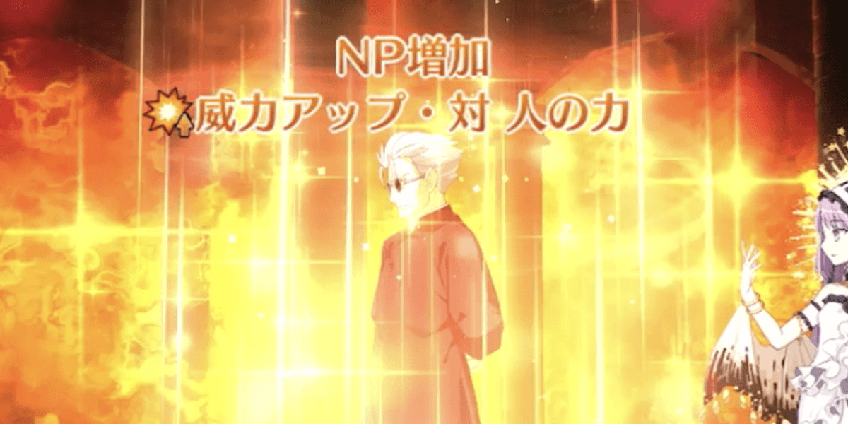 | スキル | ①自身に無敵貫通を付与(1T) ②クリ威力をアップ(1T/50%~100%) ①自身に回避状態を付与(1T) ②スター集中度をアップ(1T/300%~500%) ③スターを獲得(20個~30個) ④NPを増やす(20%~30%) ⑤〔人の力を持つ敵〕特攻状態を付与(3T/20%~30%) ①自身の攻撃力をアップ(1T/20%~30%) ②攻撃力をアップ(3T/10%~20%) ③弱体無効状態を付与(1T) |