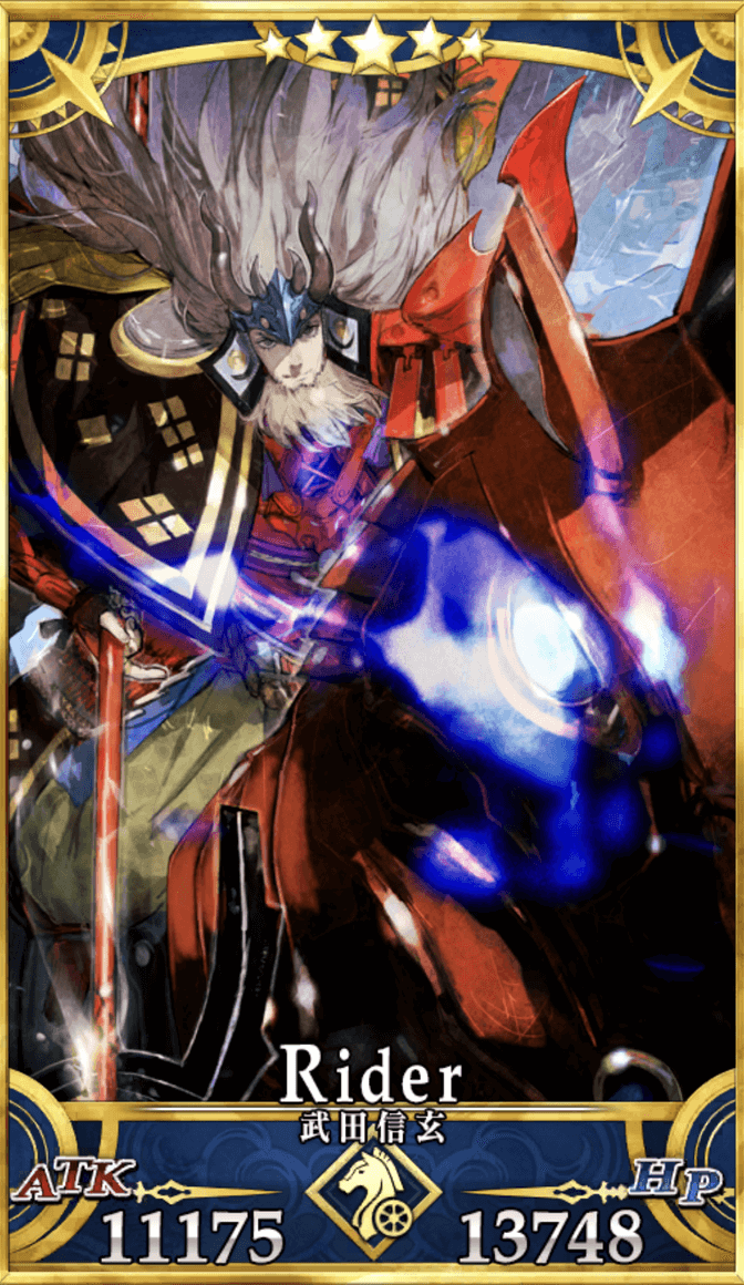 武田信玄は攻守の自己バフを持つ、自己完結型ライダーとしてスタンダートな性能の持ち主だ。NP50%と横バフを持つため周回で使えるのはもちろん、回数制無敵により場持ちが良いため、高難易度にも投入できる土台がある。