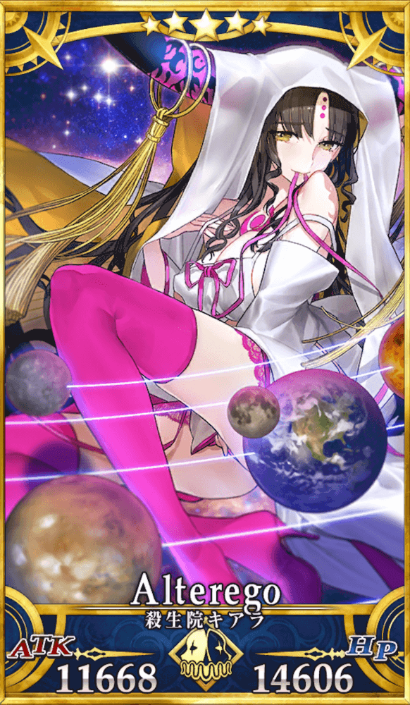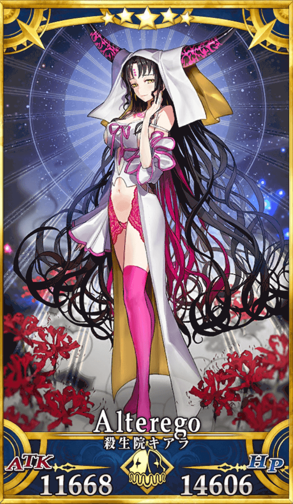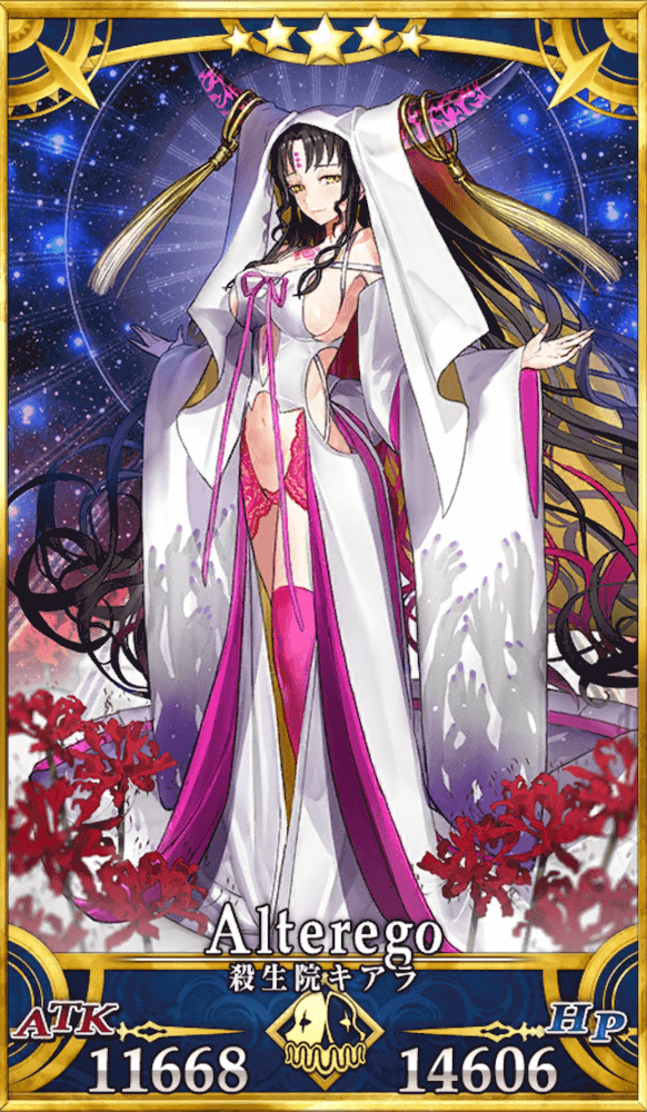 殺生院キアラは保有効果ゆえに、高難易度向けのアタッカーである。敵全体のチャージ減や強化解除で敵を妨害し、無敵貫通防御無視宝具で攻撃できる。また、NP70%チャージスキルと攻撃有利範囲が広いクラス特性に加え善特攻スキルを活かして、周回でも高難易度でも活躍するサーヴァントだ。