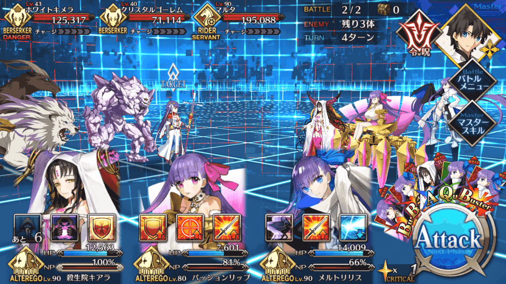 | 宝具 | ・自身に無敵貫通状態を付与(1T)<-> ・Lv敵全体に強力な防御力無視攻撃<600%~900%> ・OC自身のHPを回復<5,000~10,000> |