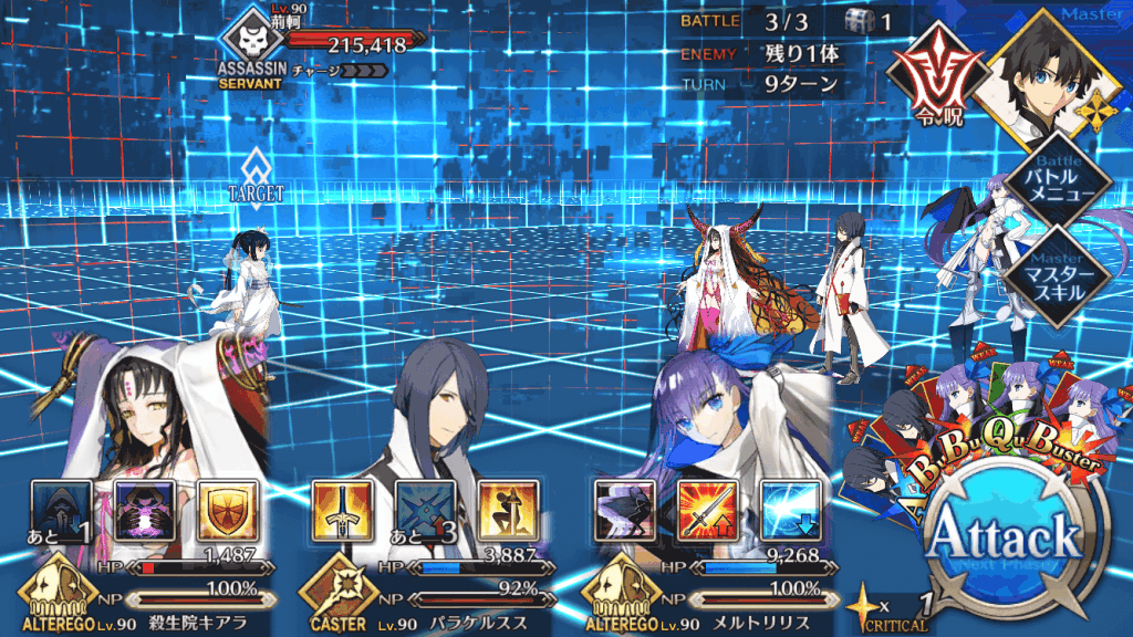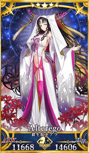 | スキル | ①敵単体の弱体耐性をダウン(1T/50%~100%) ②自身のNPをチャージ(30%~50%) ③アーツ耐性をダウン(1T/20%~30%) ①敵全体のチャージを1減らす(-) ②強化状態を解除(-) ③防御力をダウン(3T/10%~30%) ①自身に無敵を付与(1T) ②クリ威力をアップ(1T/30%~50%) ③NP獲得量をアップ(1T/30%~50%) ④弱体耐性をアップ(1T/30%~50%) ⑤HP回復量をアップ(1T/30%~50%) ⑥味方全体に〔善〕特攻状態を付与(3T/20%~30%) ⑦NPを増やす(3T/10%~20%) ⑧OCを1段階引き上げる状態を付与(3T/1回/100%) |