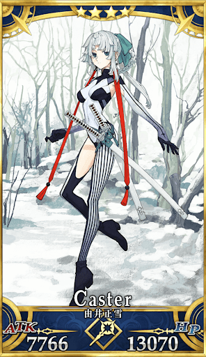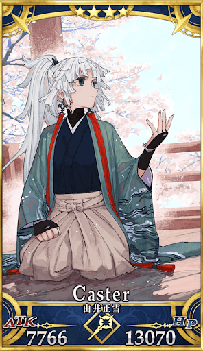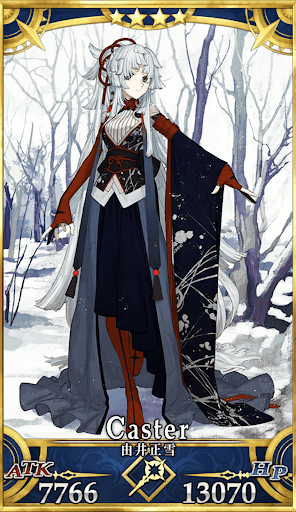 | スキル | ①自身にガッツ状態を付与(5T/1回/2000~3000) ②毎ターンHP回復状態を付与(5T/500~1000) ③弱体無効状態を付与(3T/1回) ①味方全体のNPを増やす(10%~20%) ②自身を除く味方全体の宝具威力をアップ(3T/20%~30%) ③自身に毎ターンスター獲得状態を付与(3T/5個~15個) ④敵全体の攻撃力をダウン(3T/10%~20%) ①味方単体のアーツ性能をアップ(3T/20%~30%) ②クリ威力をアップ(3T/20%~30%) ③自身のNPを増やす(20%~30%) |