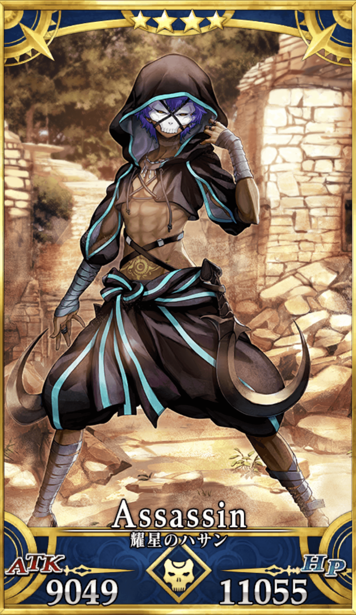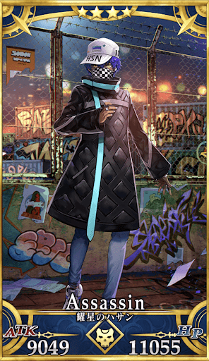 | 黒刃、黒衣、髑髏の仮面の暗殺者。 異名は「耀星のハサン」。 暗殺教団の教主「山の翁」を務めた歴代のハサン・サッバーハのひとりである。 年若くして教主と成り得たのは、 絶技とさえ呼べる異能を体得したため。 実際に教団全体の意思決定をしていた訳ではない(これは静謐のハサンも同様である)。 教団の長老たちの定めるままに、任務を果たし続けた。 |