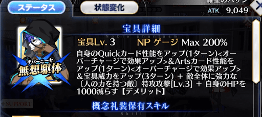| 宝具 | ・OC自身のクイック性能をアップ(1T)<OC><20%~40%> ・OCアーツ性能をアップ(1T)<OC><20%~40%> ・宝具威力をアップ(3T)<20%> ・Lv敵全体に強力な攻撃<450%~750%> ・〔人の力を持つ敵〕特攻<150%> ・自身のHPが減少【デメリット】<1,000> |