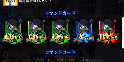 | スキル | ①自身のクイック性能をアップ(3T/20%~30%) ②アーツ性能をアップ(3T/20%~30%) ③〔暗闇〕フィールドでのみ攻撃力をアップ(3T/20%) ①自身に回避状態を付与(3T/2回) ②3ターンの間、Qの攻撃前にクリ威力をアップ(3T/10%) ③スター発生率をアップ(3T/50%~100%) ①自身のクリ威力をアップ(3T/30%~50%) ②3ターンの間、Q攻撃で自身のNPを増やす(10%) ③NP獲得量をアップ(3T/20%~30%) |