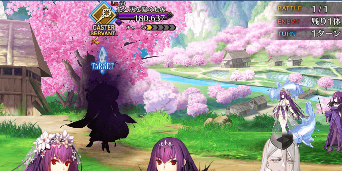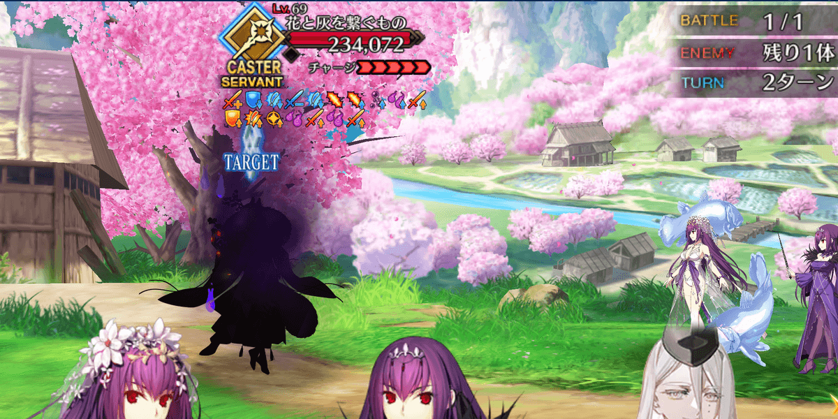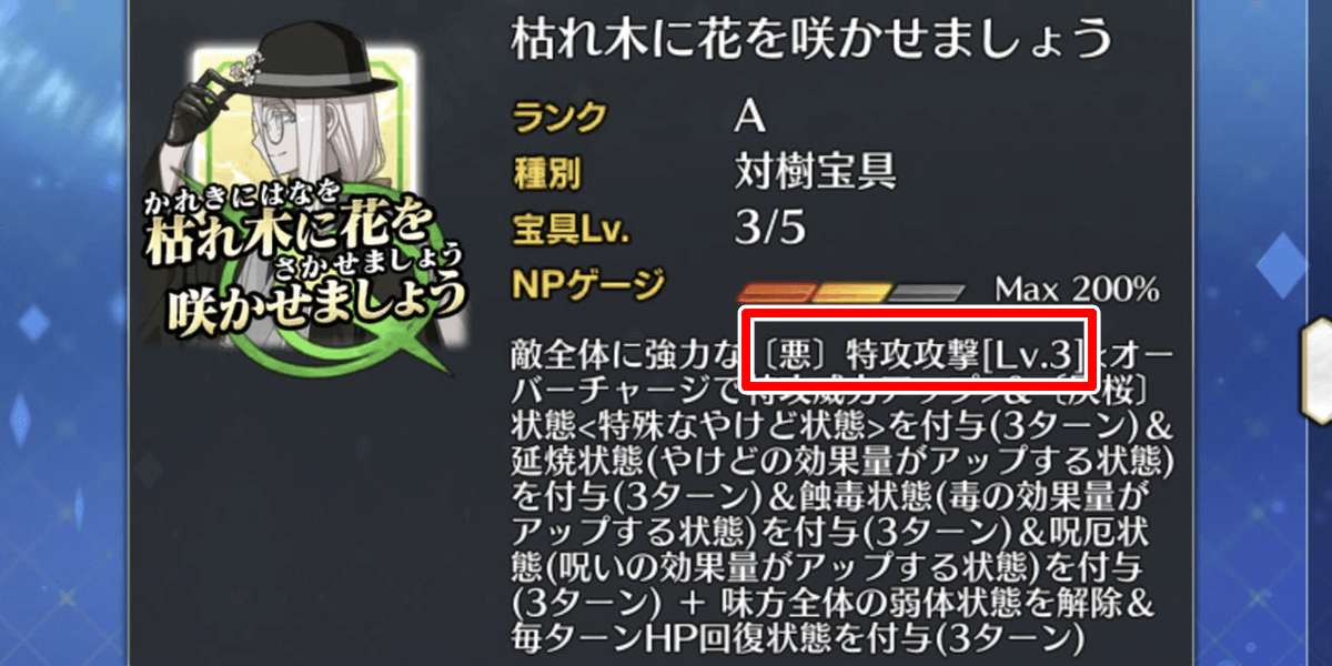 | 宝具 | ・Lv敵全体に強力な攻撃<600%~1000%> ・OC〔悪〕特攻<150%~200%> ・〔灰桜〕状態<特殊なやけど状態>を付与(3T)<1,000> ・延焼状態を付与(3T)<100%> ・蝕毒状態を付与(3T)<100%> ・呪厄状態を付与(3T)<100%> ・味方全体の弱体状態を解除<-> ・毎ターンHP回復状態を付与(3T)<1,000> |