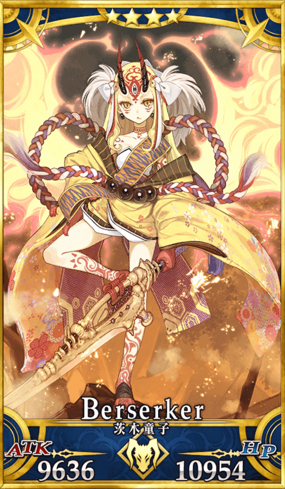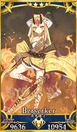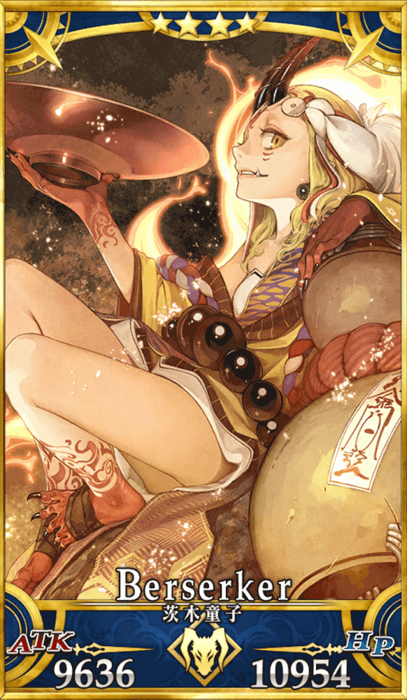 | スキル | ①味方全体の攻撃力をアップ(3T/10%~20%) ②自身の宝具威力をアップ(3T/20%~30%) ①味方単体の弱体状態を解除(-) ②HPを回復(1,000~2,500) ③クリ威力をアップ(1T/50%~100%) ④味方単体の[酒呑童子]の攻撃力をアップ(3T/20%~30%) ⑤味方の[酒呑童子]が場にいる時、自身のNPを増やす(20%) ①自身の防御力をアップ(1T/30%) ②防御力をアップ(3T/10%~30%) |