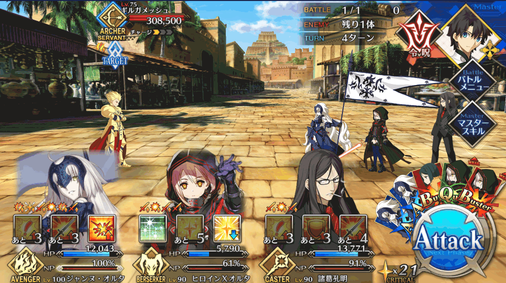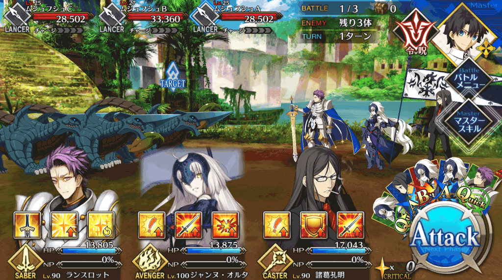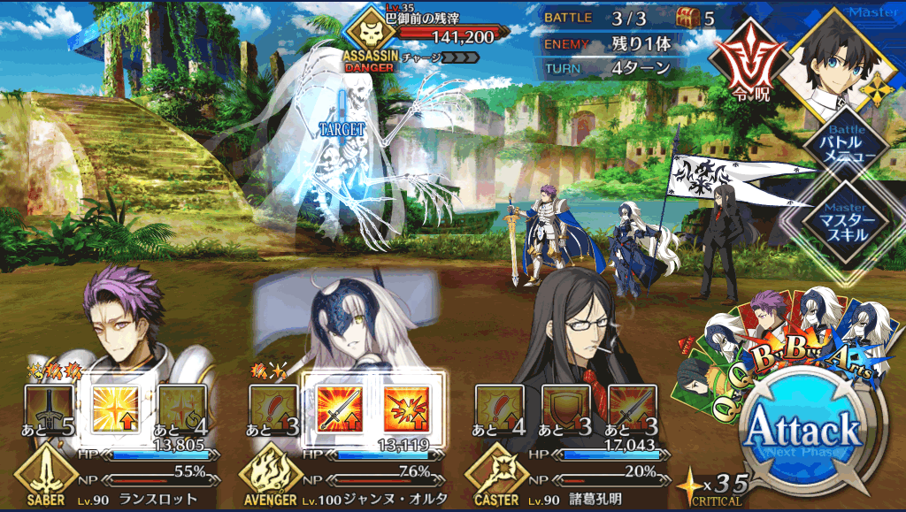| 宝具 | ・Lv敵単体に超強力な攻撃<600%~1,000%> ・強化状態を解除<-> ・OC防御力をダウン(3T)<10%~30%> |
