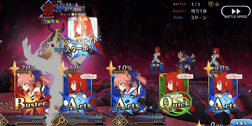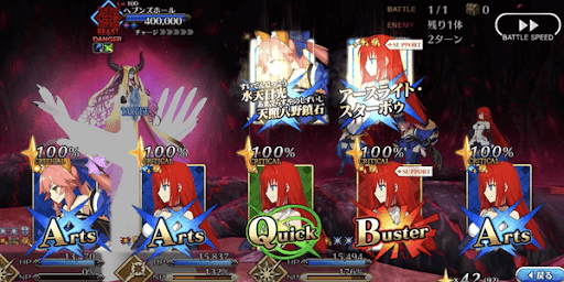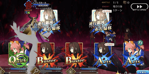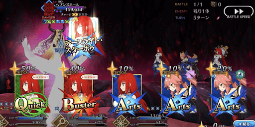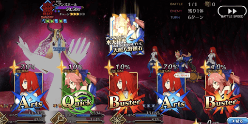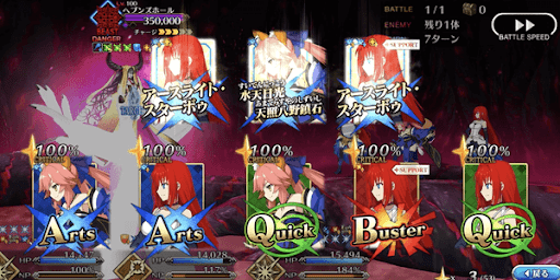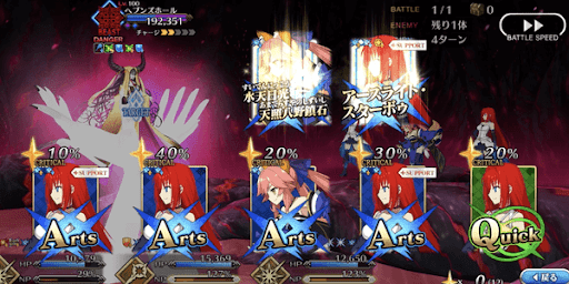 検証のために挑んだヘブンズホール戦では、1ターンから10ターンまで毎ターン1個以上の宝具が使用できた。敵が少なく被弾によるNP回収率が少なくとも、誰かしらの宝具を撃てる編成として優秀だ。なお、10ターン中、攻撃宝具を使用できないターンは1ターン目と、玉藻の宝具のみ使用した6ターン目だけだ。