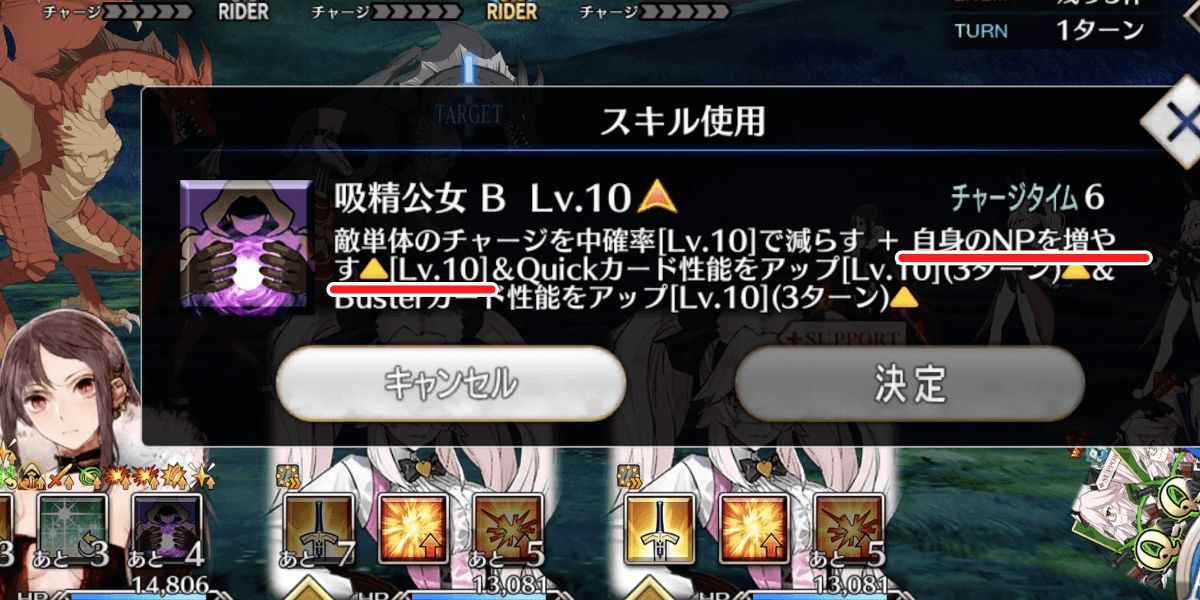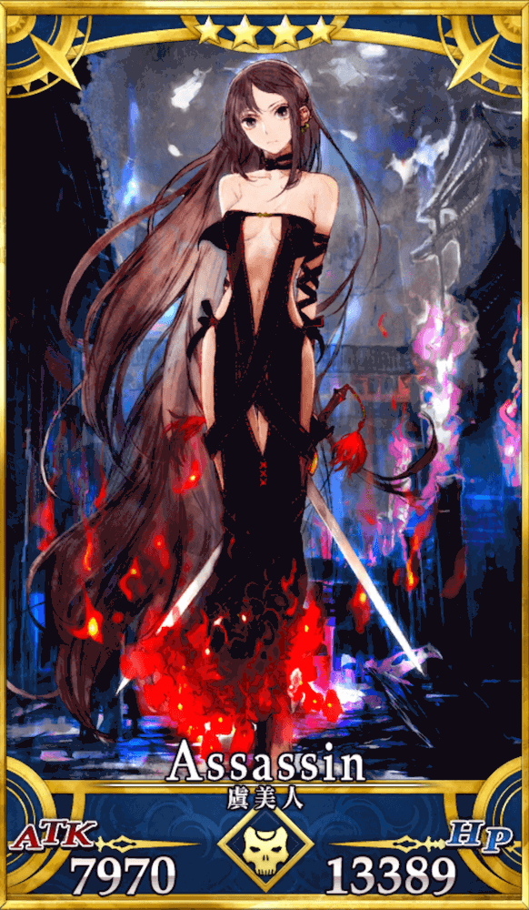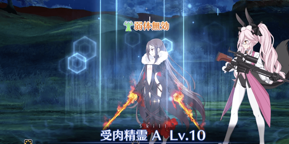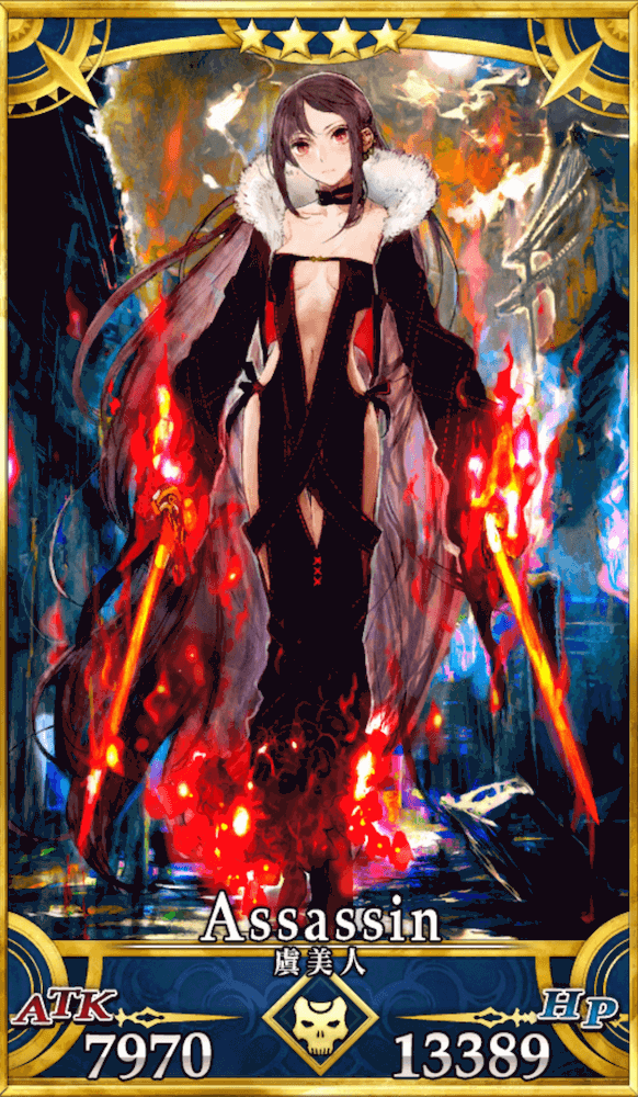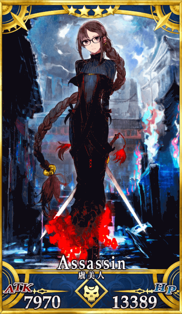 | スキル | ①自身に毎ターンNP獲得状態を付与(5T/5%~10%) ②弱体無効状態を付与(1T) ①自身に毎ターンHP回復状態を付与(5T/500~1,000) ②強化解除耐性をアップ(3T/50%~100%) ③攻撃力をアップ(3T/20%~30%) ①敵単体のチャージを確率で減らす(60%~80%) ②自身のNPを増やす(30%~50%) ③クイック性能をアップ(3T/20%~30%) ④バスター性能をアップ(3T/20%~30%) |