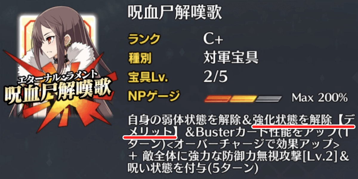 | 宝具 | ・自身の弱体状態を解除<-> ・強化状態を解除【デメリット】<-> ・OCバスター性能をアップ(1T)<50%~100%> ・Lv敵全体に強力な防御力無視攻撃<300%~500%> ・呪いを付与(5T)<2,000> |