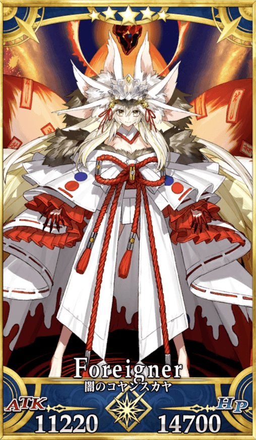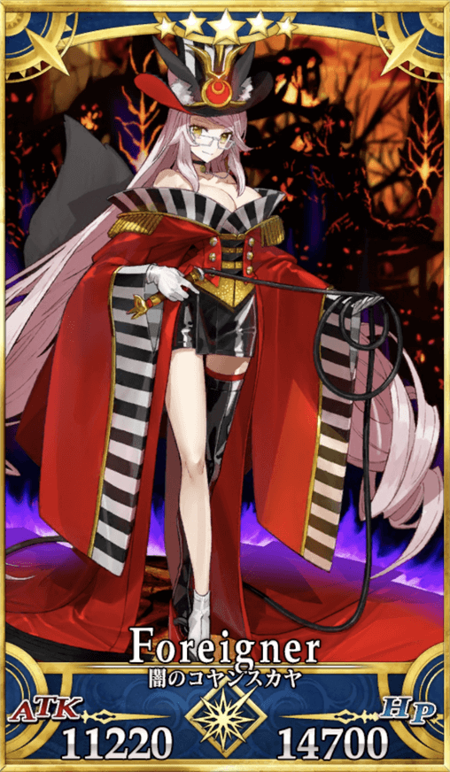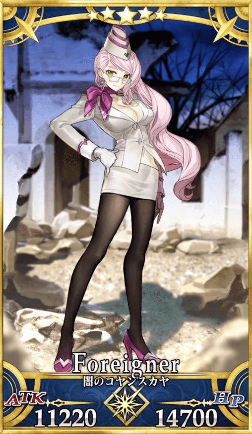 | 闇のコヤンスカヤは地特攻宝具を持つため、敵が地属性であれば90++でアタッカーとして採用できる場面もあった。しかし、90++の敵を相手取るには宝具Lv5且つ聖杯転臨は前提であるため、運用ハードルが高い。 |