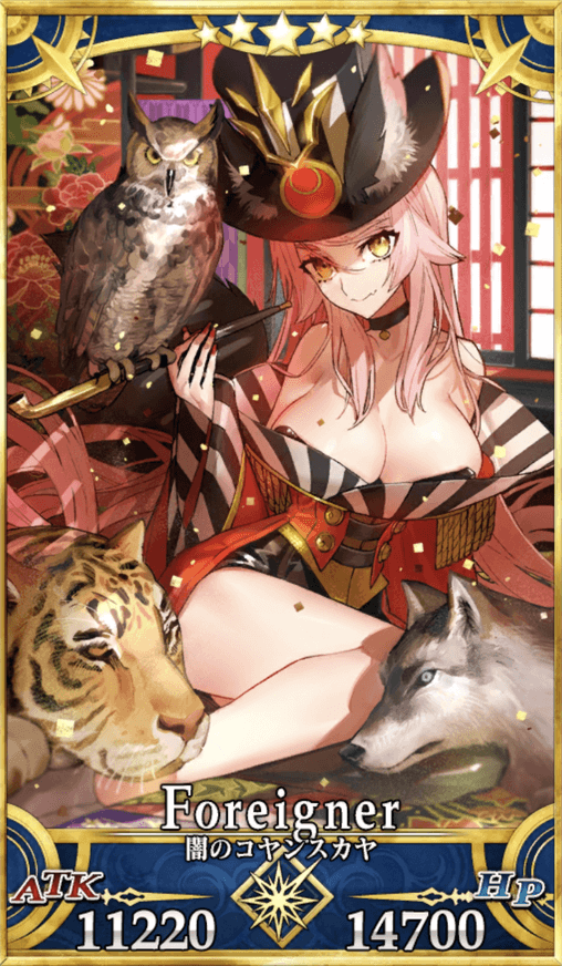 | スキル | ①味方全体のバスター性能をアップ(3T/20%~30%) ②NPを増やす(20%~30%) ③[ヒト科]のスター集中度をダウン(3T/100%) ①味方単体のOC段階を2段階引き上げる(3T/1回/2段階) ②「バスター通常攻撃時にスター獲得状態」を付与(3T/5個) ③味方全体の[ケモノ科]の攻撃力をアップ(3T/20%~30%) ④防御力をアップ(3T/20%~30%) ①自身に無敵貫通状態を付与(3T) ②クリ威力をアップ(3T/30%~50%) ③「攻撃で毒・呪い・やけど付与」状態を付与(3T/300~500) ④敵全体に蝕毒・呪厄・延焼状態を付与(3T/50%~100%) |