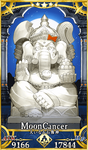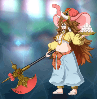 | ○砕折されし牙:B 象頭の神の特徴、折れた右の牙を示すスキル。 パラシュラーマの斧が父神シヴァの与えたものだと見抜き、あえて避けずに受け止めたために牙が折れたという逸話が有名。 異説も多く、牙は最初から折れていたとも、月に向かって投げつけたからだとも言われる。 ○ヴィナーヤカ:EX ガネーシャの別名。「無上」を意味する。 また、これは『障害となる者』の性質を持つ魔神の名でもあるとされる。 それは『その障害を乗り越えれば成功が訪れる』という意味に繋がり、結果として『障害を除去する神』の信仰を生み出すこととなった。 |