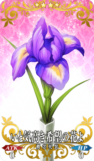 ランスロット(セイバー)からのバレンタインのお返し。 ランスロットから贈られたアイリスの花。 花言葉は希望。良い便りなど。 しかしこれ、さすがに少々鼻についていないだろうか ……と、己のプレイボーイぶりに悩むランスロットなのであった。 |