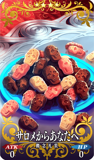 サロメからのバレンタインチョコ。 サロメが普段持っている『銀のお盆』レプリカの上に、 小さなドクロ型チョコレートがいっぱい。 口に入れると甘くとろける、甘い甘いチョコレート。 決して呪詛の類などはかかっていない…… かかっていないはずなのだが…… じっと見つめていると胸の奥がざわつく。 何らかの魔力で形成しているのか、 常温で置いたままにしていると溶けてしまう。 なので、早めに食べないといけない。全部。 |