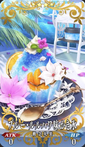 スカサハ=スカディ(ルーラー)からの贈り物。 北極圏特異点に存在していた氷をモデルにして魔力で再現した氷…… から作られた、特製のかき氷。 女神が手ずからかき氷器を回して作ってくれたとか。 口にするたび、あの夏の日々の思い出が蘇る。 シロップは『ブルー・ルルハワ』。 ブルーハワイの亜種で、同じ味らしい。 |