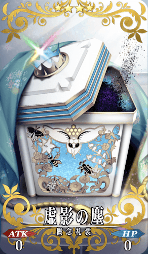 オベロンを騙る何者かからのプレゼント。 爽やかな彩の容器に入ったものは、手に取るとさらさらと散り行くパウダースノウ…… でもなんでもなく、煤のような黒い塵。 どう見ても『虚影の塵』そのものです。 舐めると塩の味がする。まさに塩対応。 「中身の価値はもう過ぎたものだけど、 入れ物の輝きだけは、変わらないものかもね?」 |