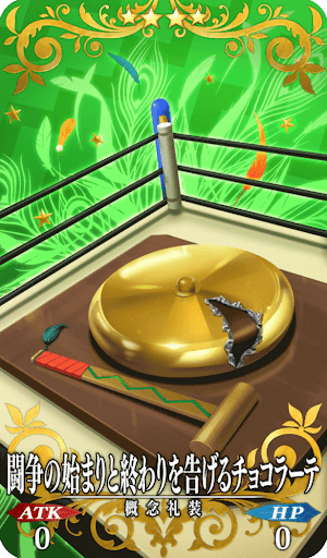 ケツァル・コアトル[サンバ/サンタ]からのバレンタインチョコ。 リング脇のテーブルによく置いてある平たいベルに形が似ており、なぜか木槌を使って叩くとちゃんと音がなる。 っていうかゴングだコレ。 その音色は、一つ叩くと歴戦の戦士たちに瞬時に戦闘態勢を取らせる効果があり、乱打すると闘争中の戦士達に決着の訪れを知らせる効果があるという。 ただし金色の包装紙を剥ぐと中身はとても甘いチョコで、食べるとモリモリ元気(パワー)が湧いてくる。 我慢のできなくなったあなたがサンバを踊り始めようと、ローブを跨いでリングに上がろうと、心優しき女神は笑顔でそれを一緒に楽しんでくれるだろう。 |