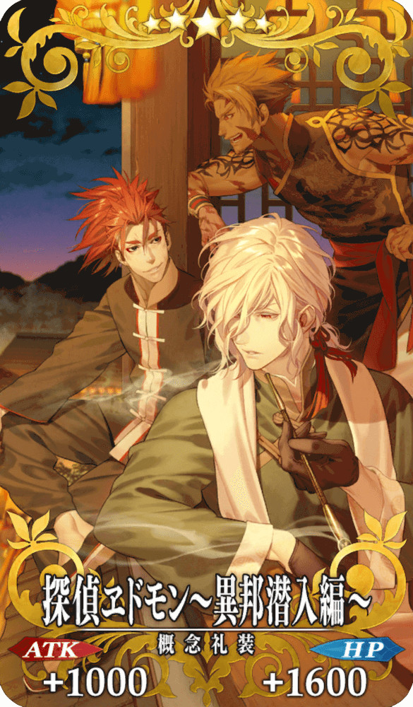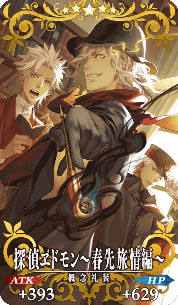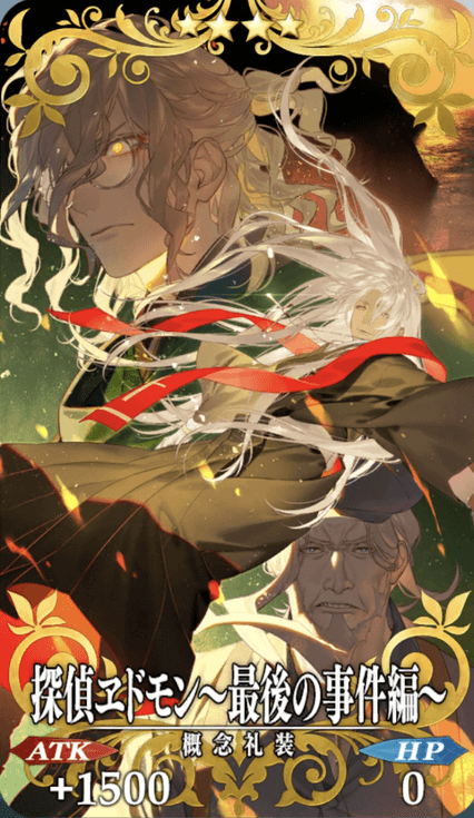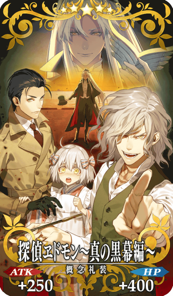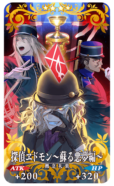 星4礼装の中なら「探偵ヱドモン〜最後の事件編〜」がおすすめ。「登場時にスターを獲得する」効果は、クリティカル運用で短期戦を狙う場面で確約できる。スターの獲得量は未凸で10個、凸で12個と、2個しか変動しないため、未凸で複数枚持つのも有りだ。