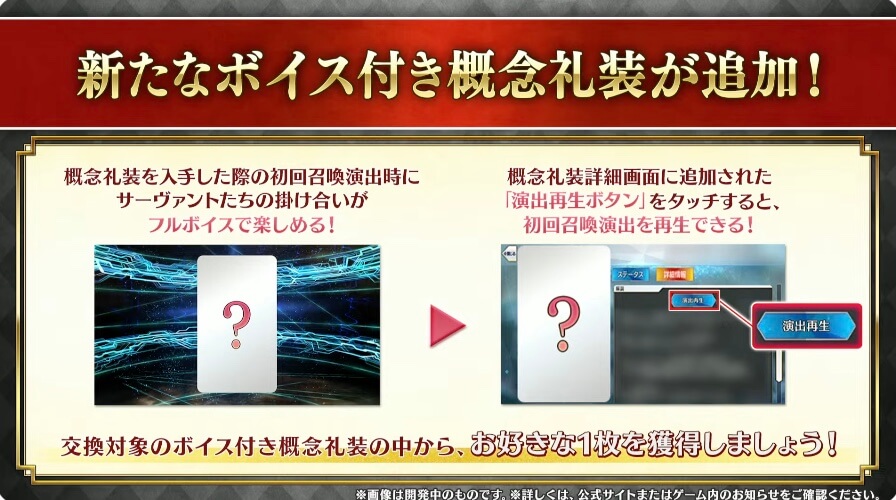 CBC2026の礼装は、マテリアルがフルボイスで再生される。礼装を入手してマテリアルに登録されれば、いつでもマテリアルからフルボイス動画を再生できる。