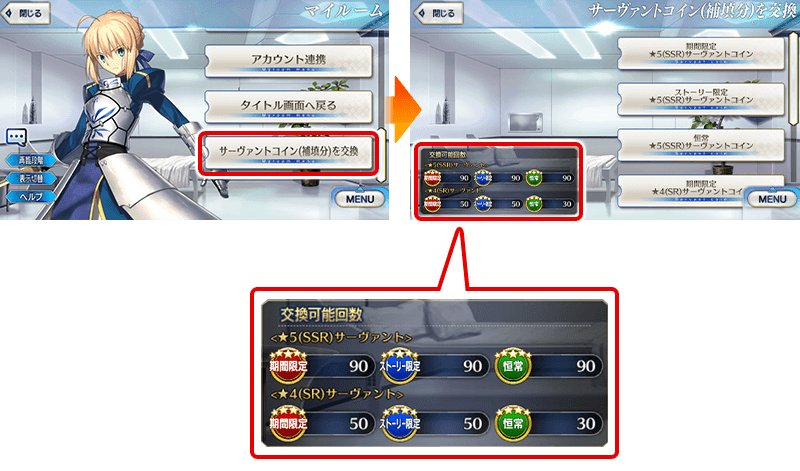 サーヴァントコインの補填は、マイルームのメニュー最下部にある「サーヴァントコイン(補填分)を交換」で行える。補填対象者にのみメニューが表示され、交換できるコインの枚数などが表示される。
