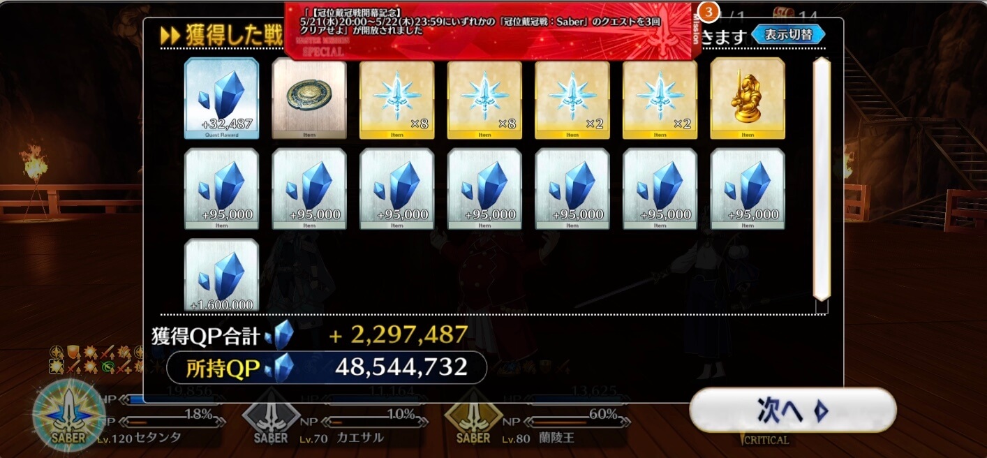 冠位研鑽戦でドロップを狙う