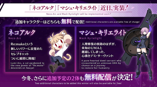 | 内容 | ・新規アイテム「ピュアプリズム」登場 ・チュートリアルミッション追加 ・「監獄塔に復讐鬼は哭く」無料開放 ・「アルジュナ&カルナ体験クエスト」無料開放 ・霊衣縫製に巌窟王&アルジュナ霊衣追加 |
