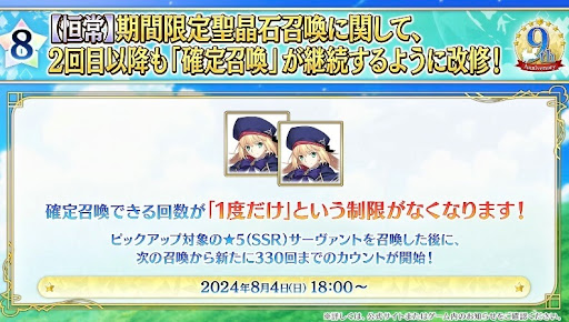 「確定召喚」と呼ばれる天井システムにより、ピックアップ対象の星5サーヴァントが330回目に確実に手に入る。ただし、329回目までにピックアップ星5を入手した場合は天井カウントがリセットされ、次の天井には再度330連が必要だ。