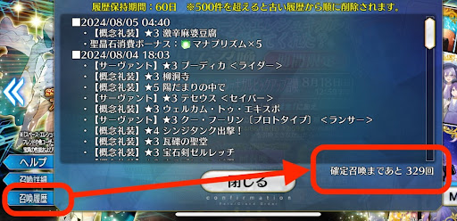ガチャの結果や天井までのガチャ回数は、各ガチャ画面左下にある「召喚履歴」をタップすると確認できる。過去に回したガチャ履歴一覧が確認できるほか、右下に天井までのカウントが表示されている。