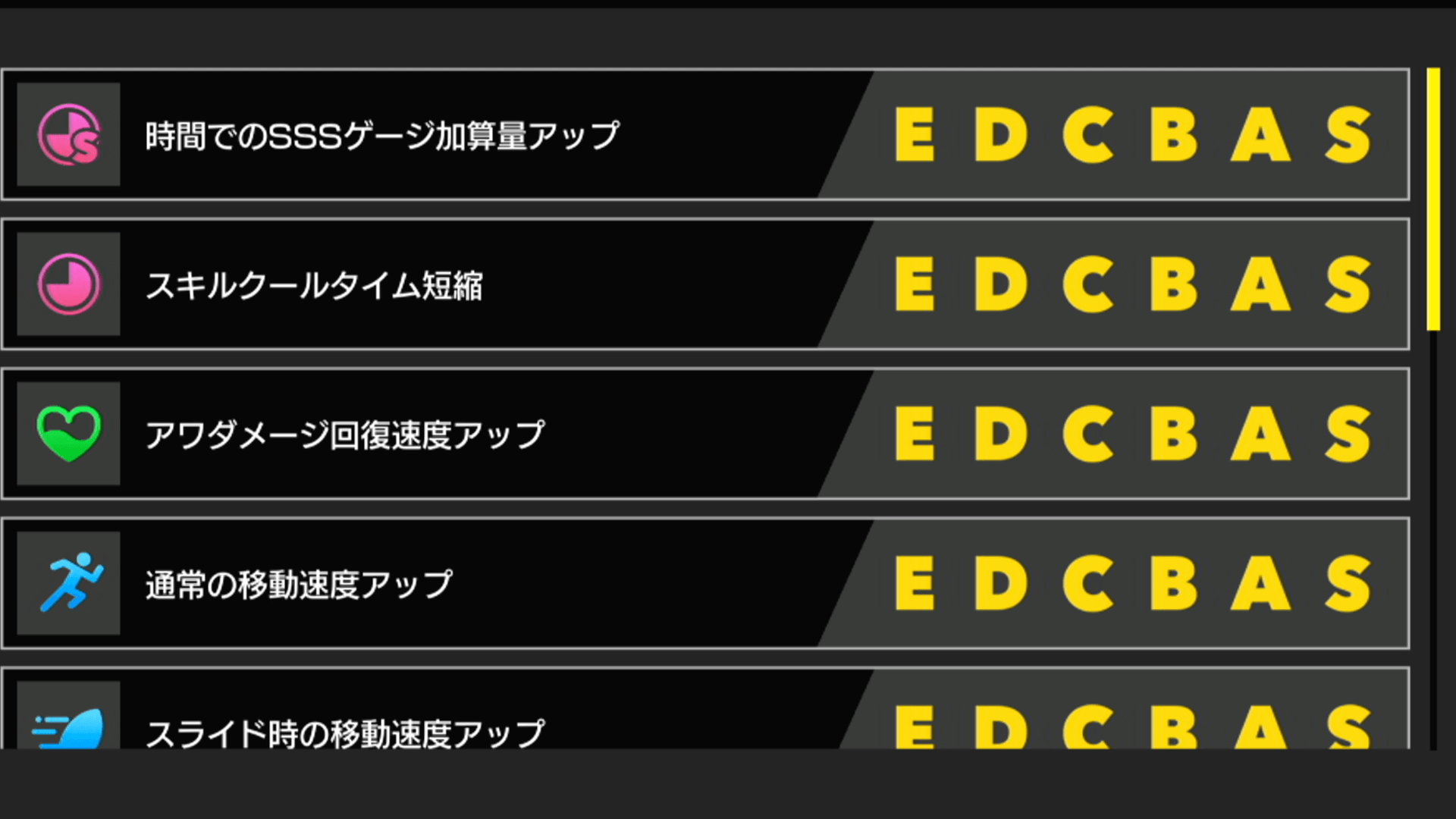 | ▼アタッカー向け | ・ヒット時SSSゲージ量アップ ・通常の移動速度アップ ・アワダメージ回復速度アップ |