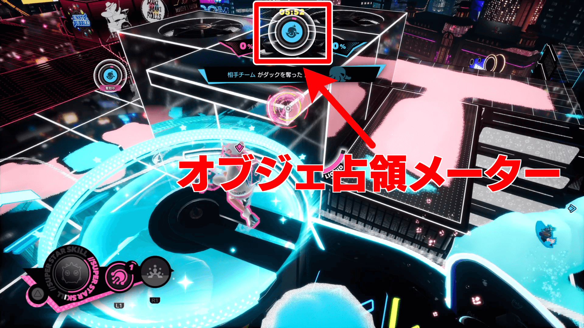 オブジェを占領するには、台の上に一定時間乗る必要がある。メーターがたまり切る前に倒されるか、台から離れてしまうと最初からメーターがため直しになるため、敵が周囲にいないのを確認してから占領するのがおすすめ。