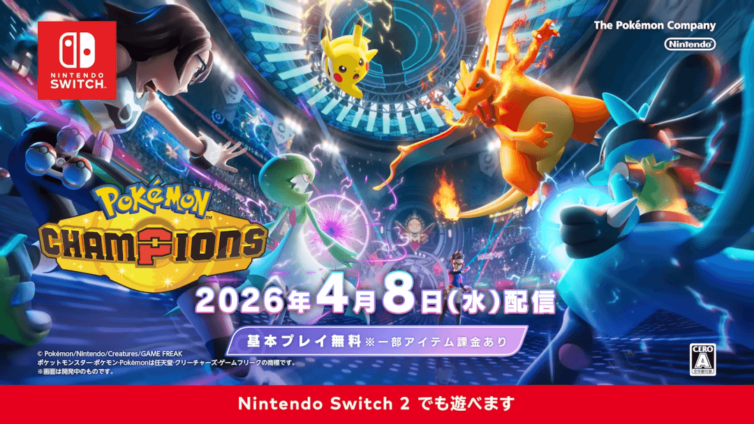 「Pokémon Champions(ポケモンチャンピオンズ)」の配信日はSwitch版が2026年4月8日、スマートフォン版が2026年夏である。Switch版はSwitch2でも遊ぶことが可能だ。