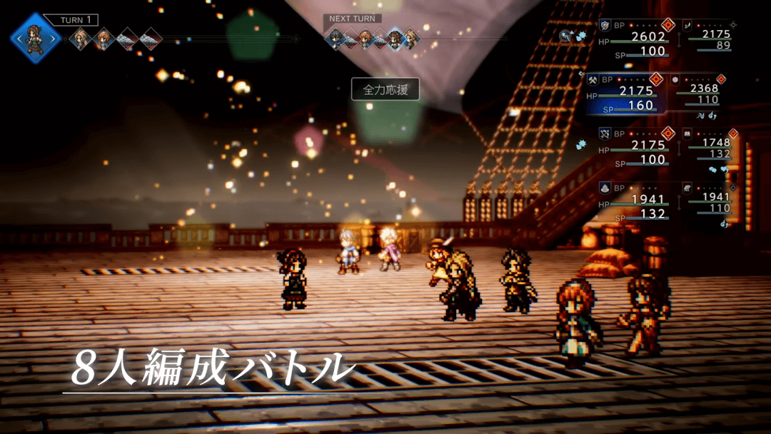 オクトパストラベラー0は「8人編成コマンドバトル」を採用しており、30人以上の仲間たちの中から8人を選んで自分だけのパーティを編成できる。前衛と後衛を入れ替えることで戦況を変えたりできるほか、敵の弱点を突くことで隙を作れる「ブレイク」や、ターン毎に貯まるブーストポイントによる強化など様々な要素で戦略を構築できるぞ。