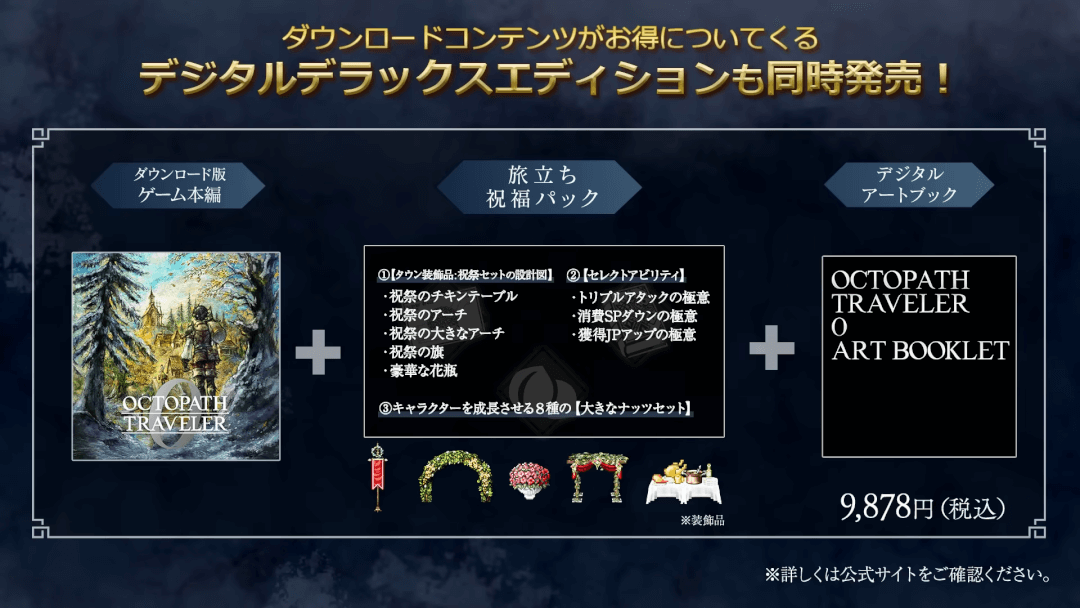 | コレクターズエディション | ・『オクトパストラベラー0 デジタルデラックス アップグレード』コード ・オクトパストラベラー0 聖火神の指輪 21号 ・オクトパストラベラー0 トラベラーズトランプ ・オクトパストラベラー0 富・権力・名声のオクトダイス ・オクトパストラベラー0 ゲームマット オルステラ大陸地図 ・OCTOPATH TRAVELER Arrangements Break & Boost Vol.3 ・オクトパストラベラー0 アートブックレット ・パッケージ版初回封入特典『旅立ち応援パック』 |